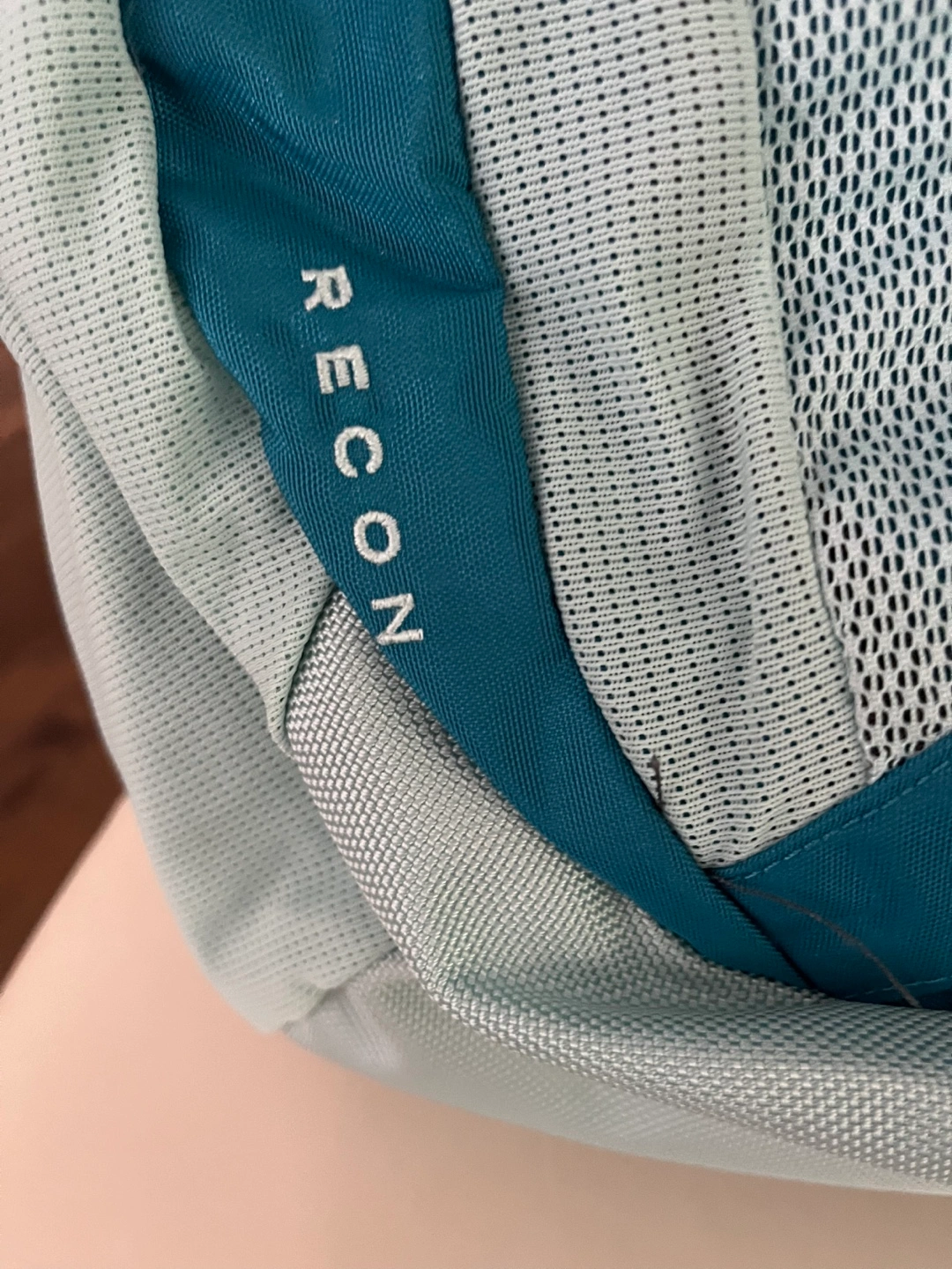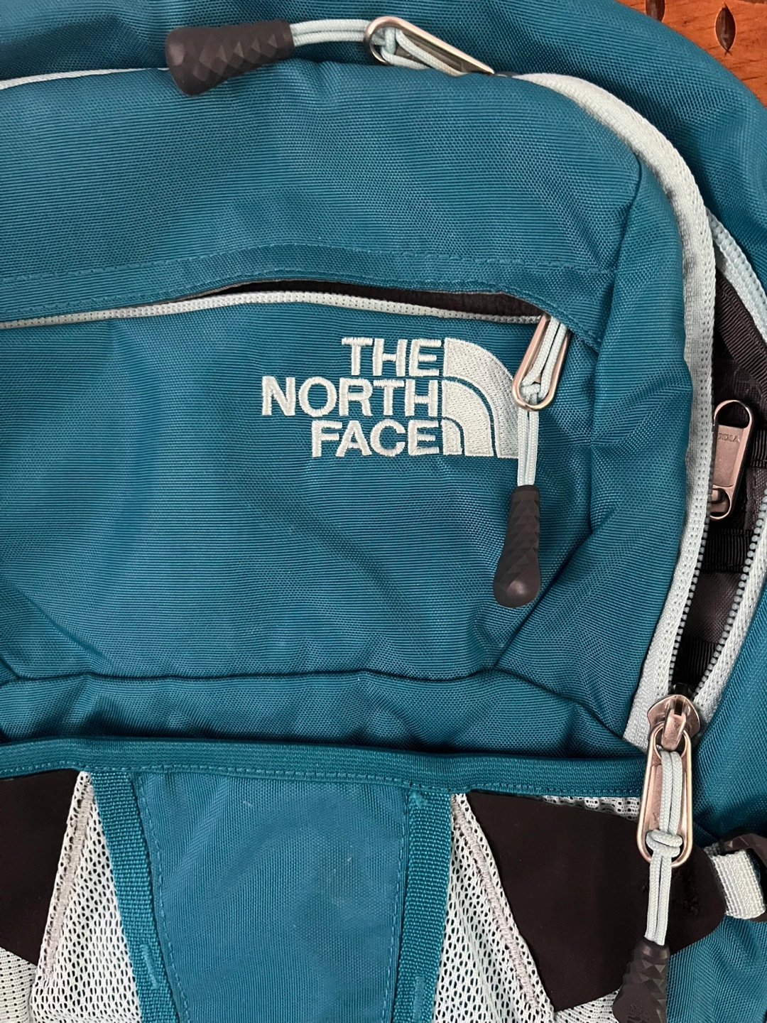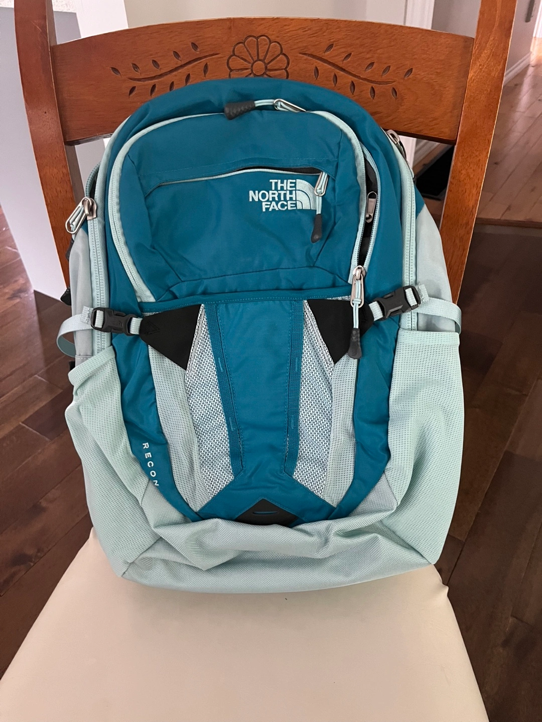 A nice, teal-coloured backpack. Several compartments. Has a mesh area on the sides. You will love using this backpack to take a walk through a park.