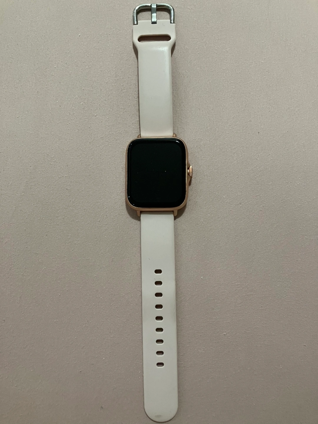 I'm selling this smartwatch. The band is a light pink colour. The watch has a square-shaped face with a gold-coloured casing. You'll find that this smartwatch is the perfect accessory for your daily routine and will make life easier.