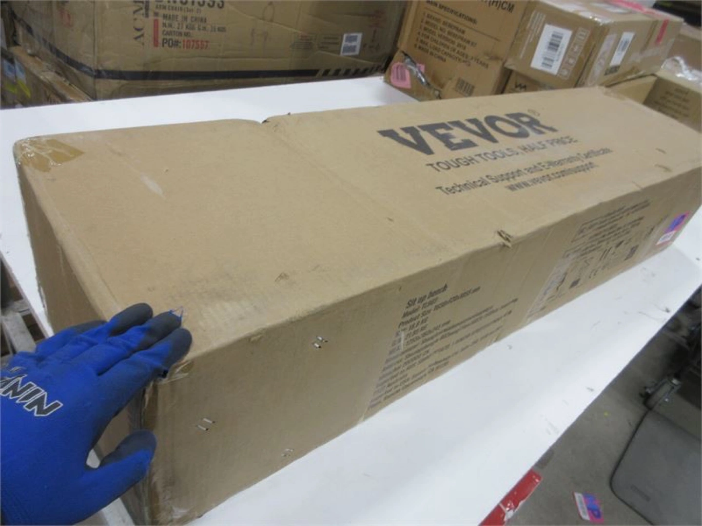 A VEVOR sit up bench still in its original packaging. The box shows signs of wear, but the item inside should be in excellent condition, ready for a great workout. This bench will bring you to a tranquil state while exercising your body.