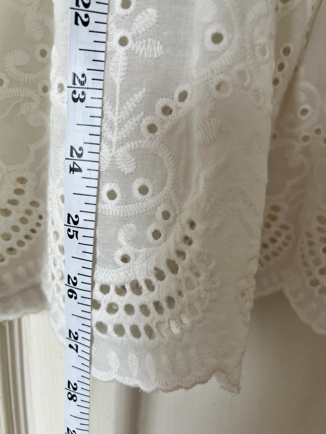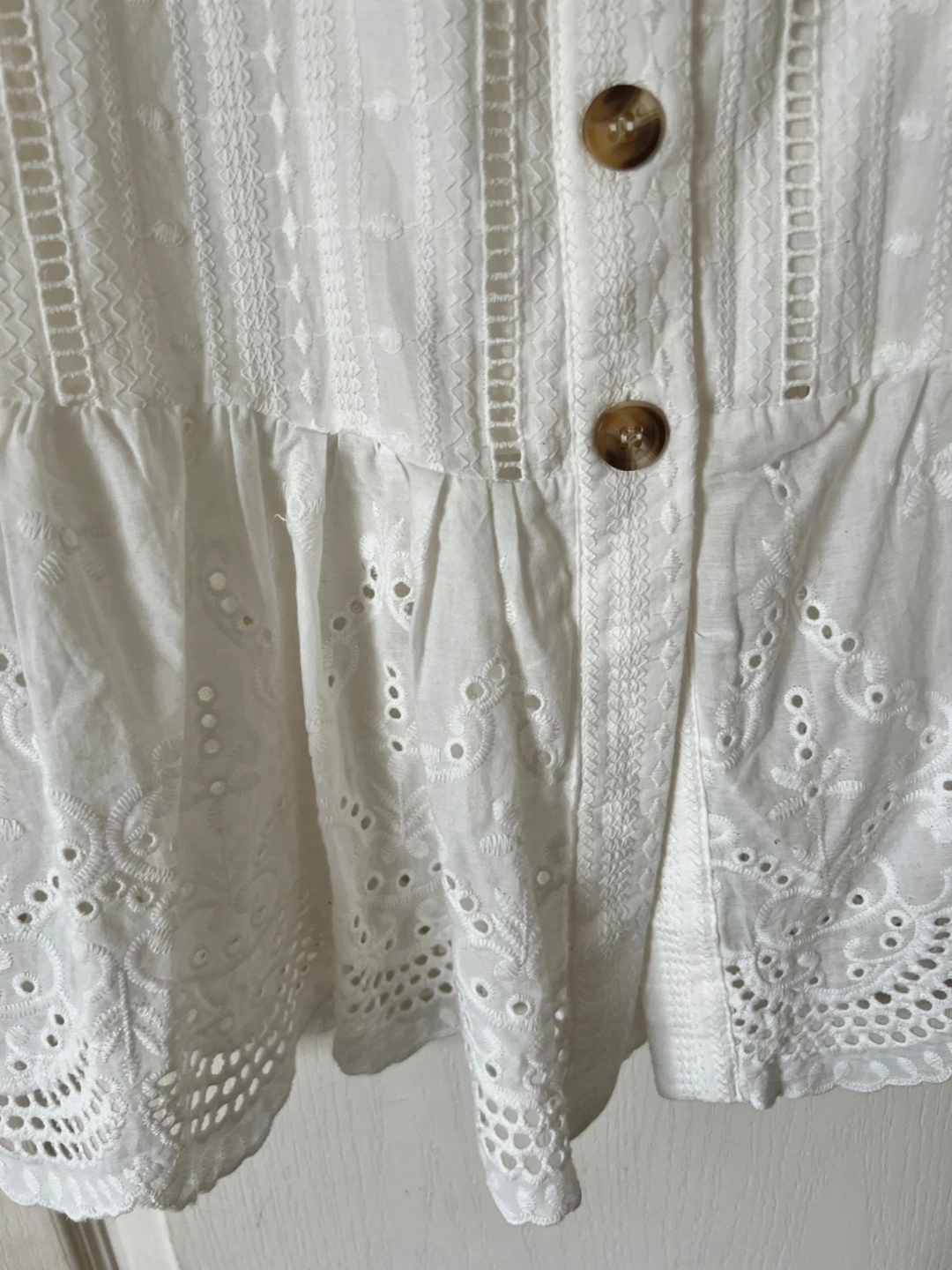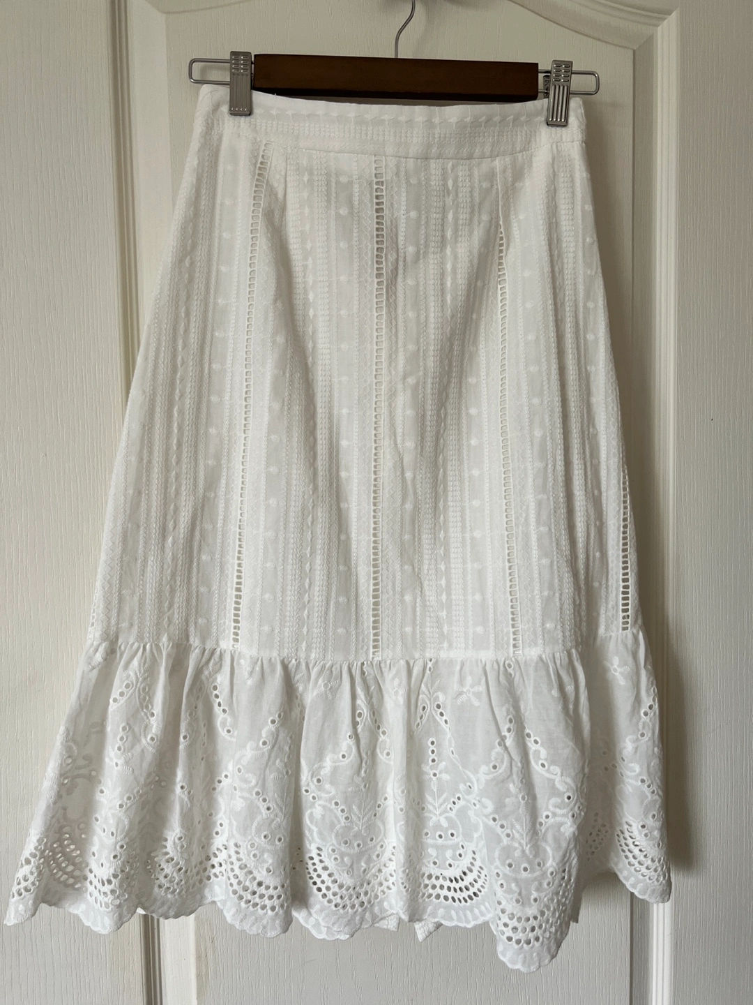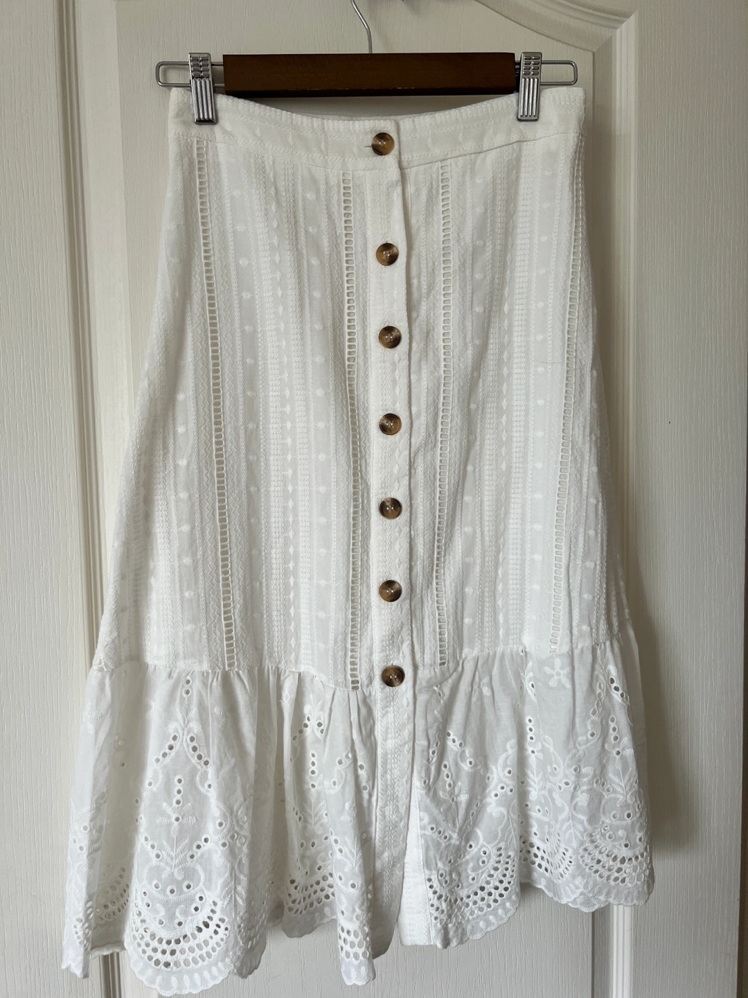 A beautiful white lace and eyelet skirt I never got to wear. Functional buttons down the front. Perfect condition - no flaws. Been sitting in my closet while I gained weight 🤣.