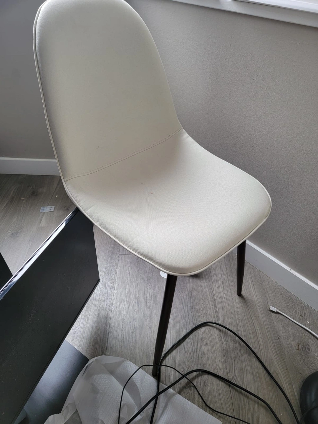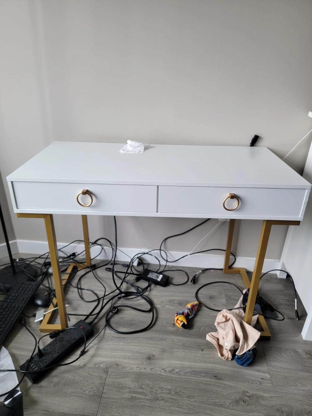 Cream-colored chair. Has black legs. White desk, two drawers with gold hardware. The desk is supported by gold legs. It's the perfect place to sit and have a moment of quiet reflection.