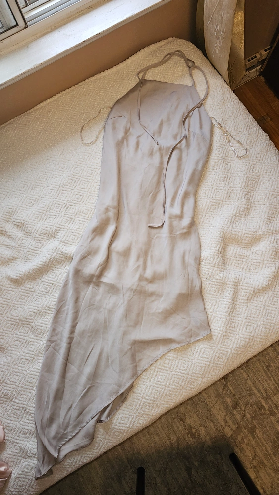 Beautiful silk dress. Features a halter top with tie details. A lovely choice for special events especially in the summer.