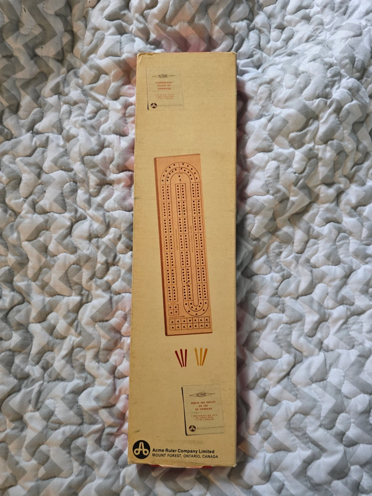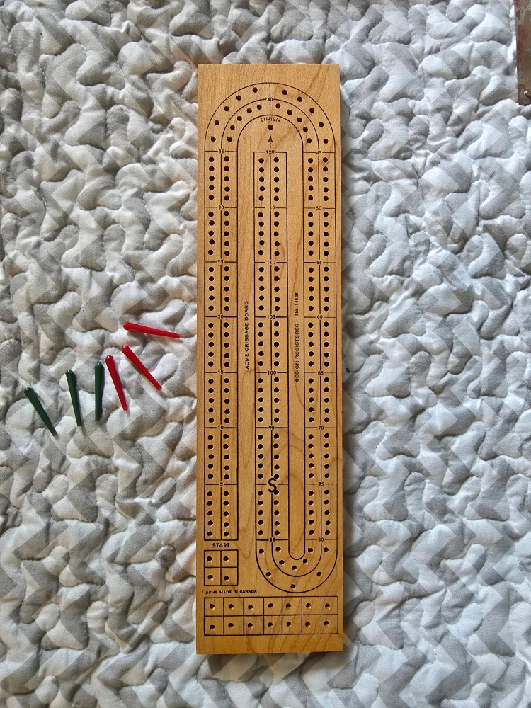 A classic cribbage board game. It comes with a wooden board. Also comes with pegs and a set of instructions. You can find so much peace playing this game with a cup of tea.