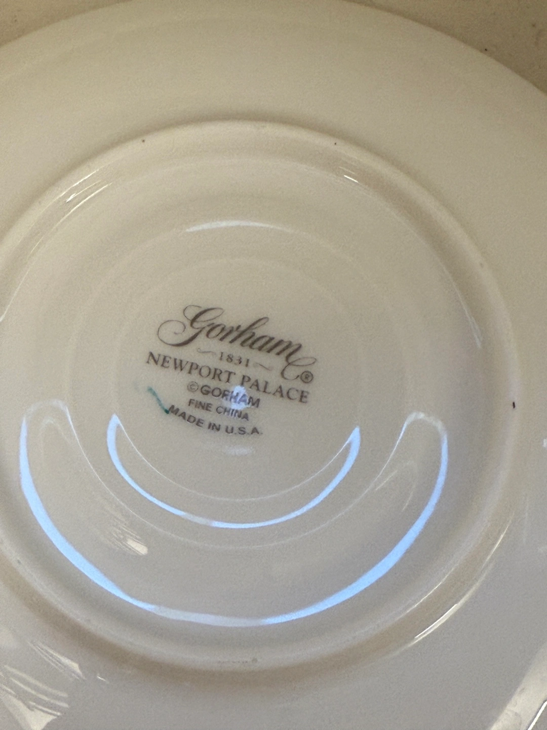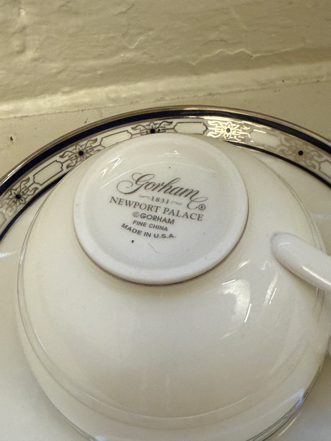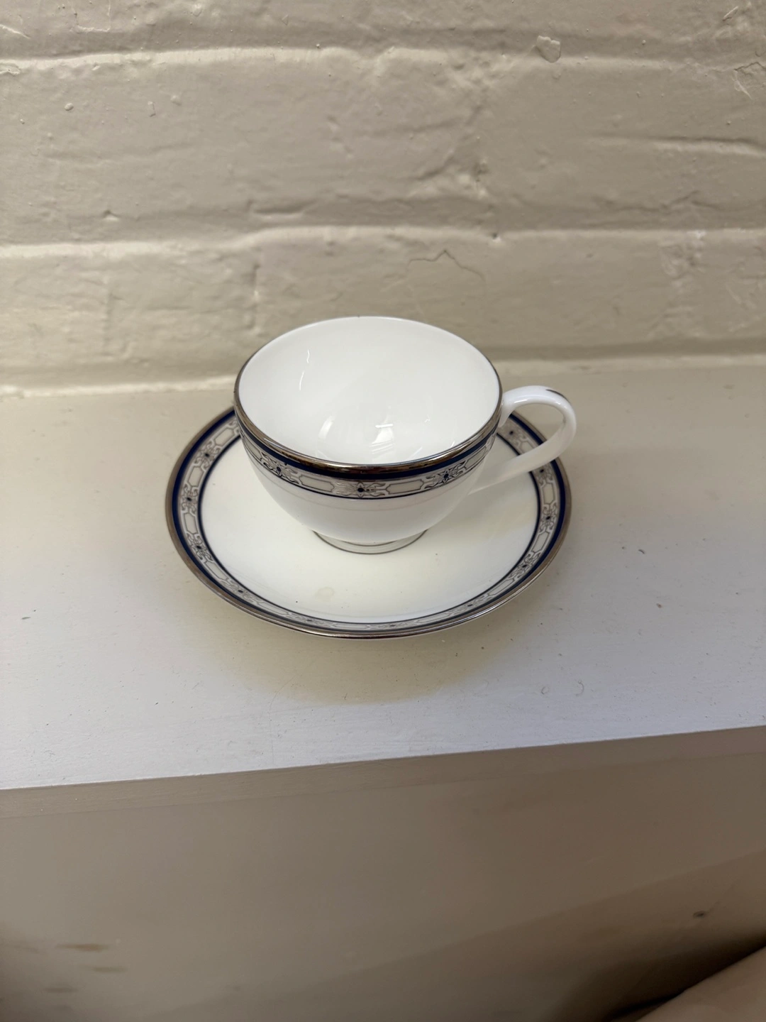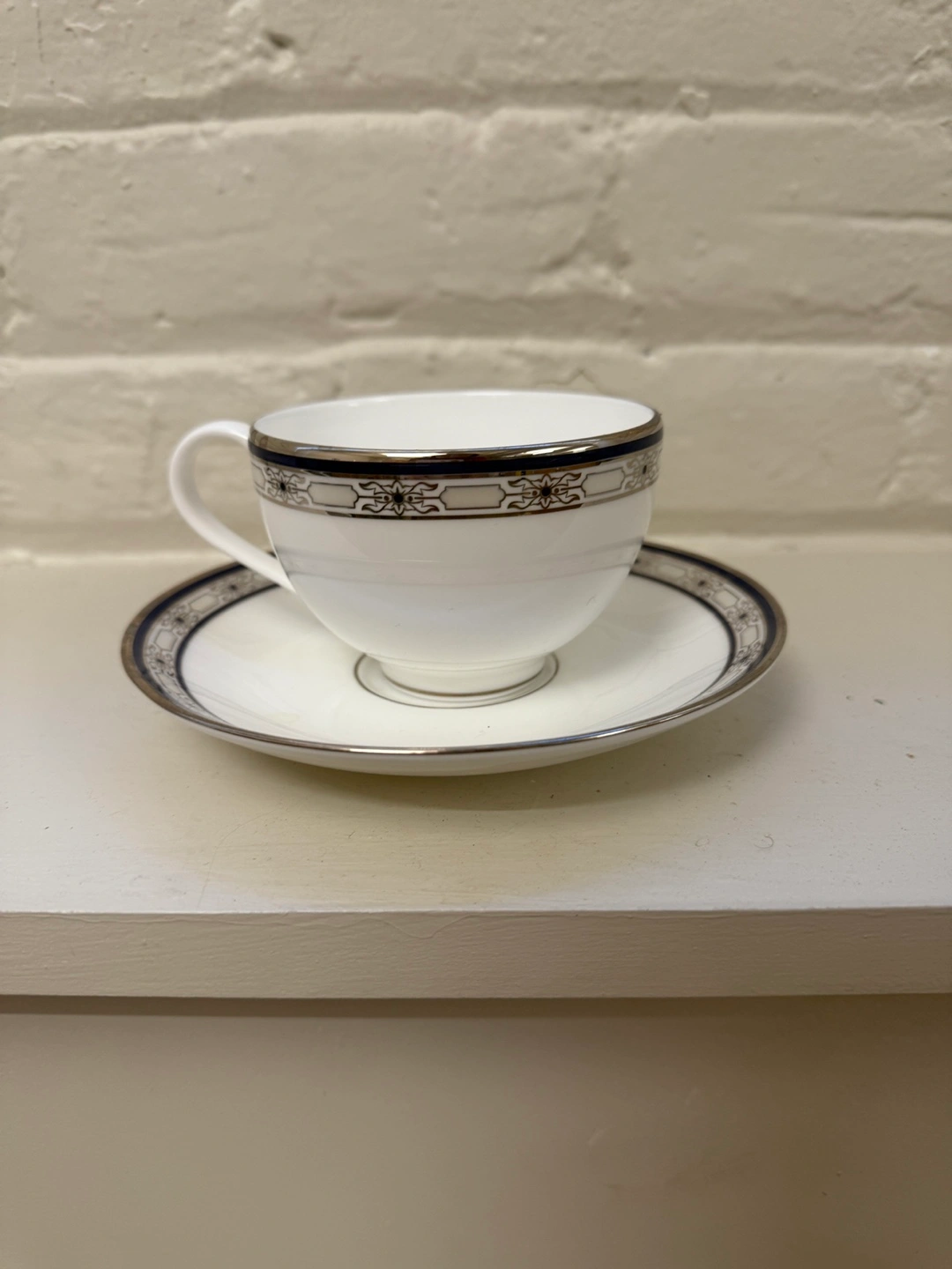 A porcelain cup with saucer. The cup with a handle. They both have a blue and silver trim design. Made in the U.S.A.. Consider enjoying a quiet moment with a warm cup of tea in this lovely set.