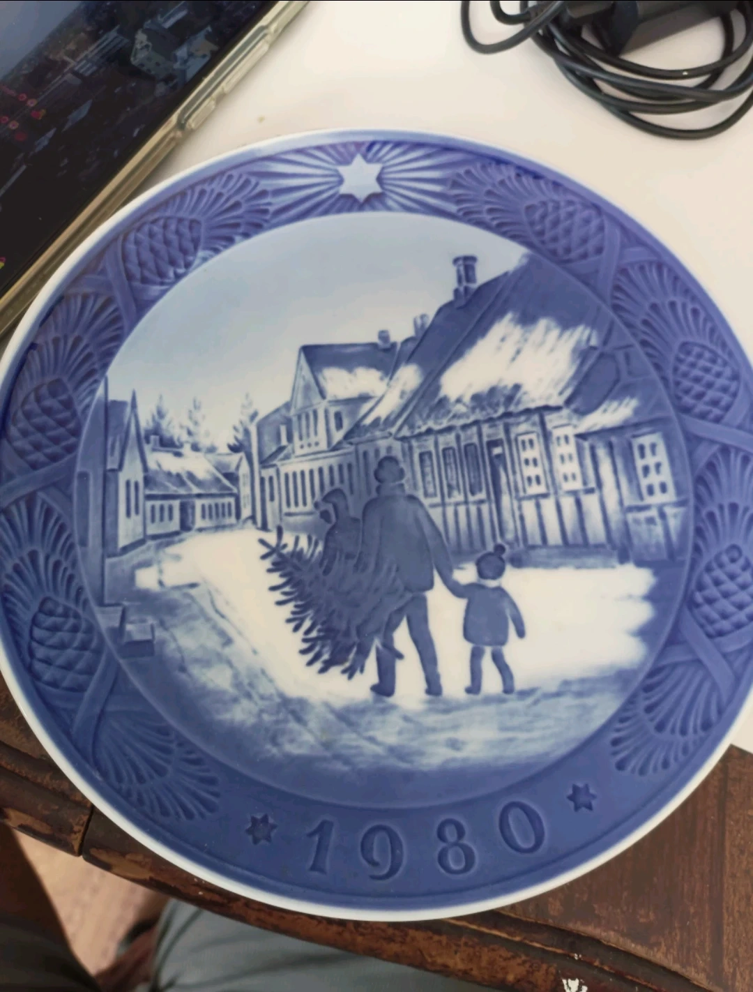 A beautiful plate, with a nice blue trim. A village scene with a person carrying a tree. Would look fantastic on a wall to add some tranquility to your home.
