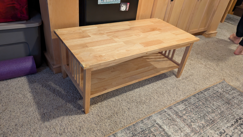 Coffee table with a light-colored wood finish. Features a lower shelf for additional storage. Would be great for placing a puzzle or books on to relax with.