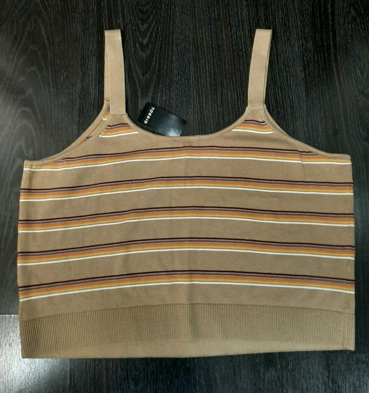 The colour scheme has a nice soft touch. It is a tank top style crop sweater with stripes in multiple colors. Made from 100% cotton, this tank top can be a wardrobe staple to layer and mix and match.