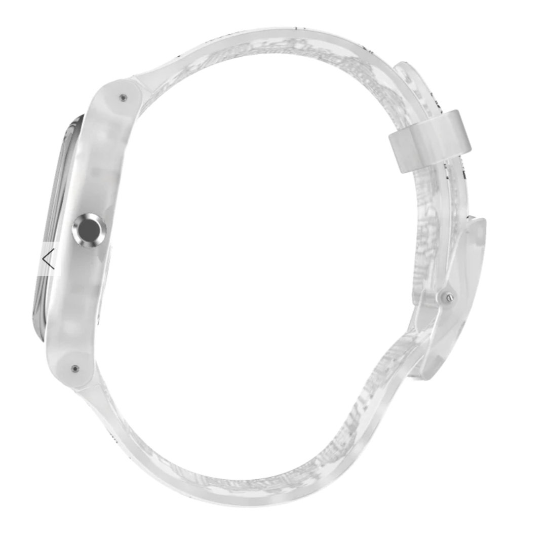 A cool watch from Swatch. Features a see-through band with an art print. The face includes a flag with calligraphy. Maybe use it as a reminder to live peacefully and enjoy your day.