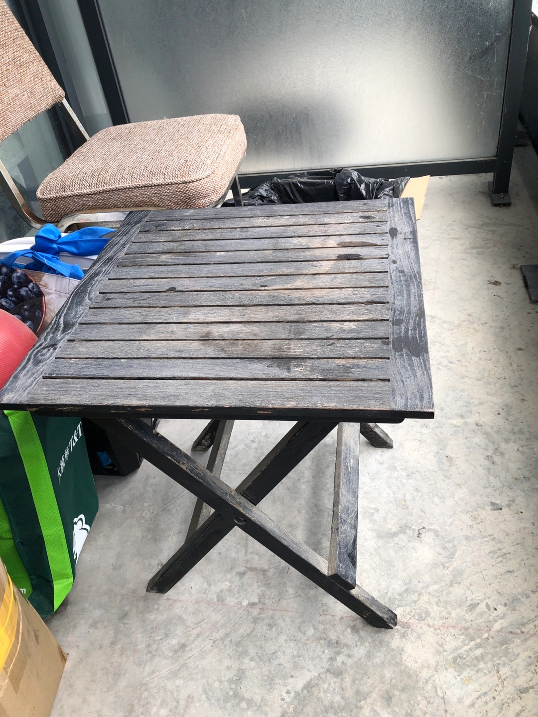 Square table with a slat top. Cross-legged base. Perfect for enjoying a nice cup of coffee while you're watching the sunrise.