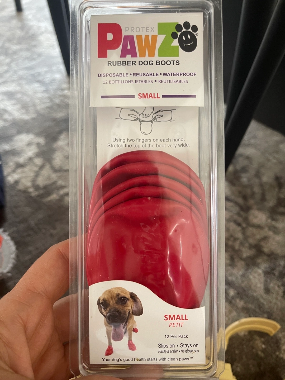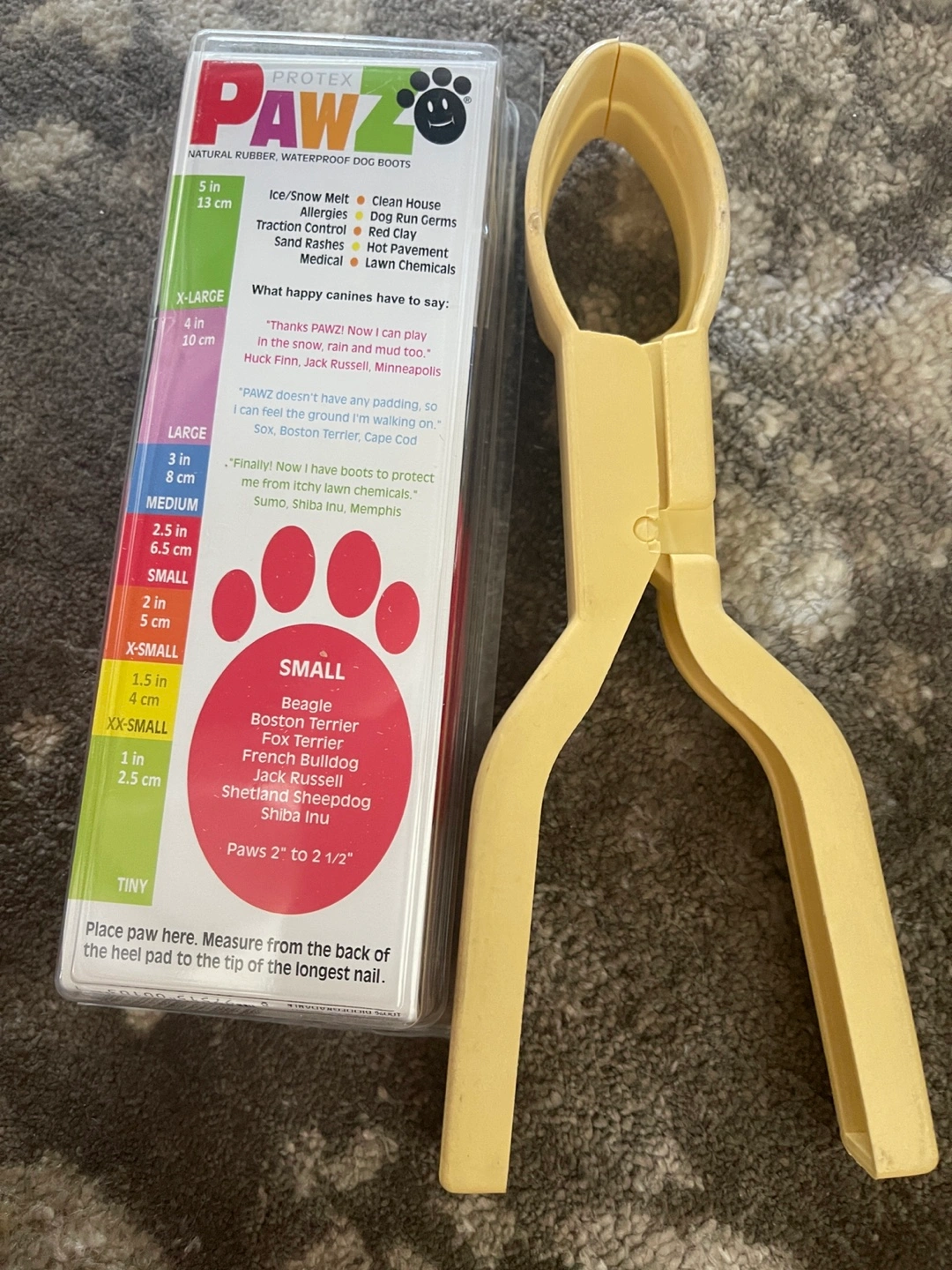 4 plastic booties In size Small, Included is a package of red rubber dog boots. Brand new never opened. Also, an applicator tool for easy placement. Consider these boots for safe and fun outdoor activities for your furry friend.