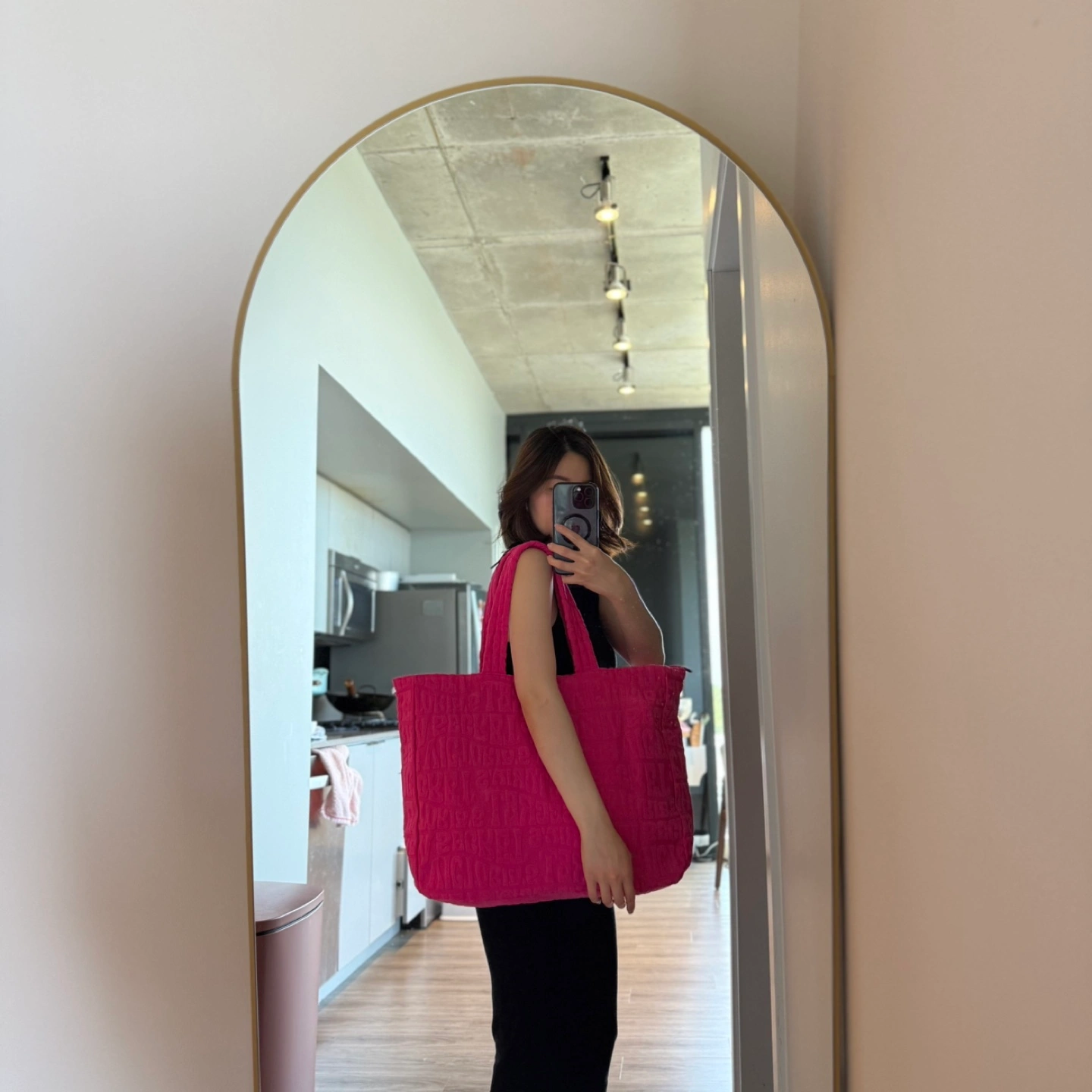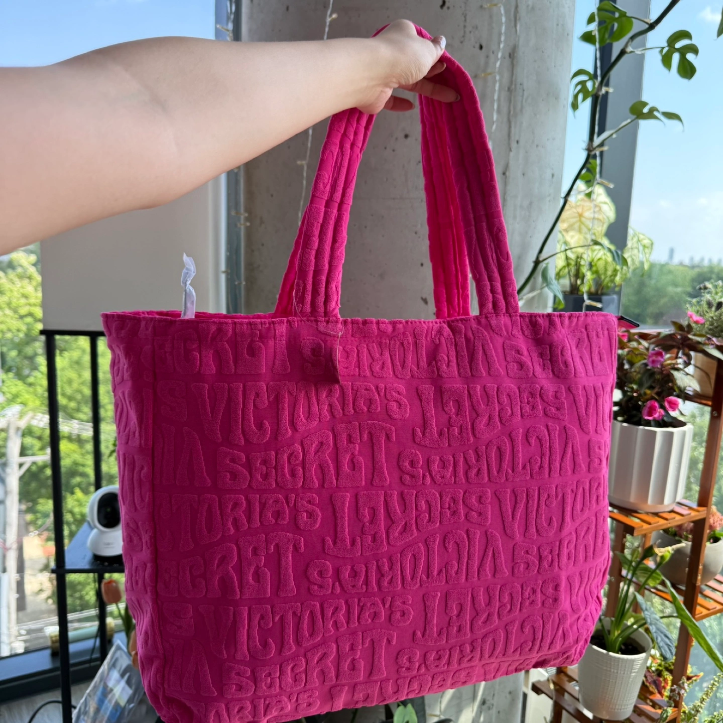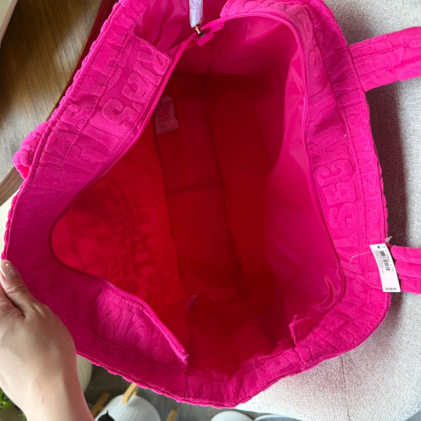 This is a Victoria's Secret Pink terry tote bag in a vibrant pink color! It's a stylish and spacious bag perfect for everyday use. was originally priced at $49.95