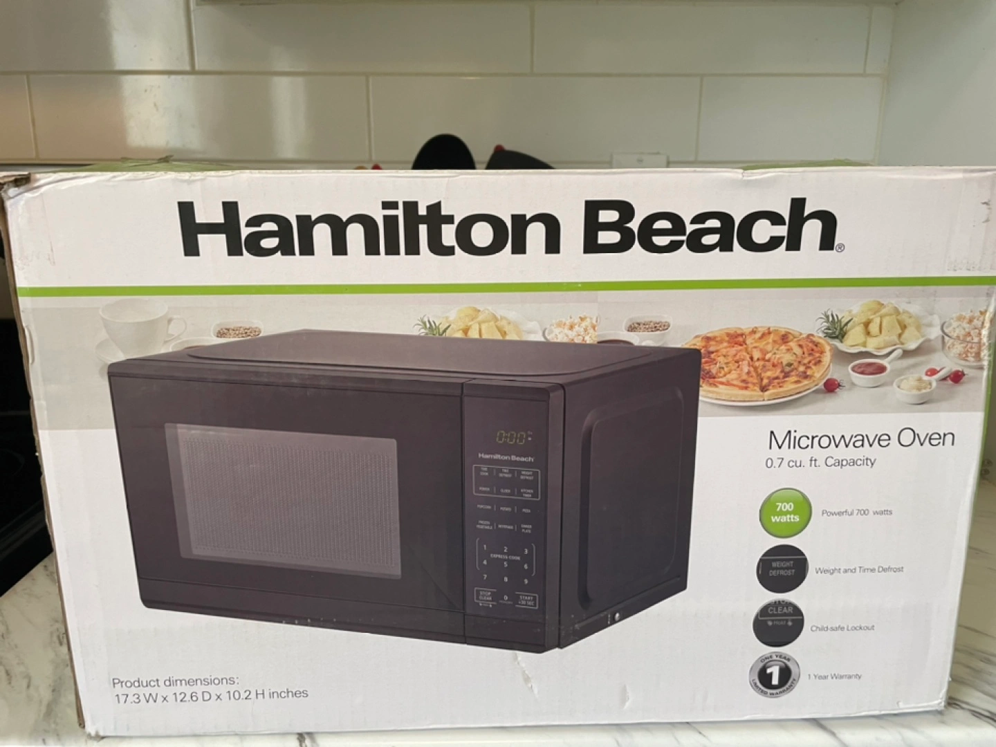 Selling a Hamilton Beach microwave oven! It's in great condition and ready to use. It's a compact 0.7 cu ft capacity, perfect for smaller kitchens or apartments. The box is included, and it has powerful 700 watts for quick and efficient cooking