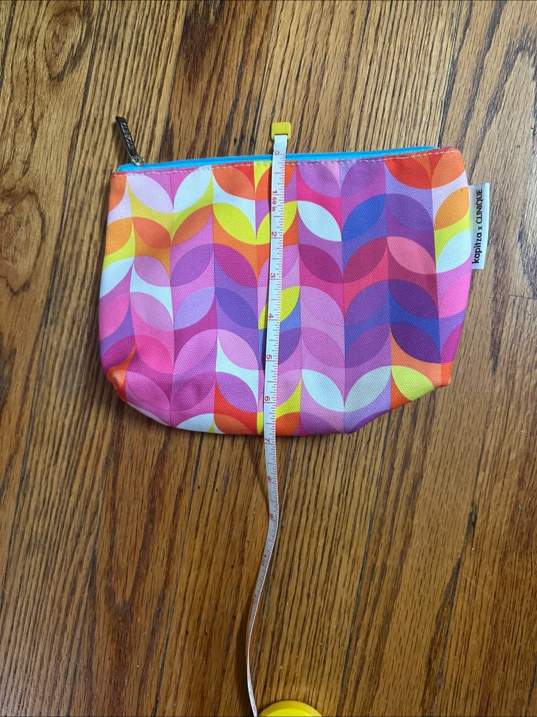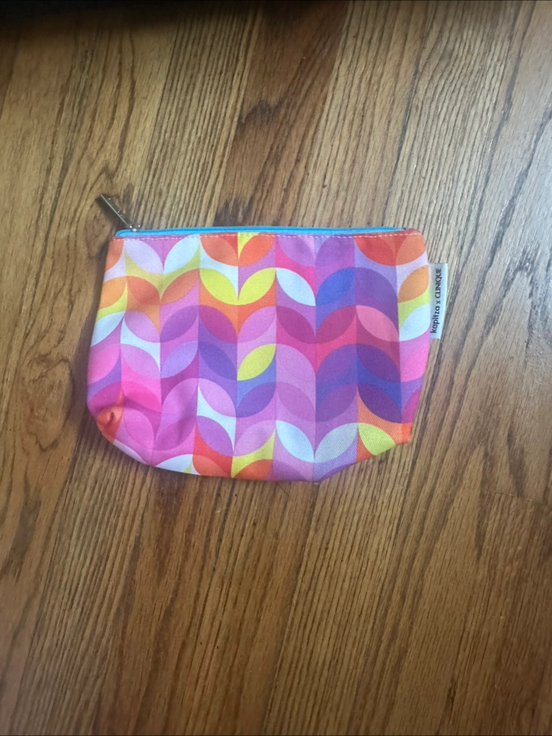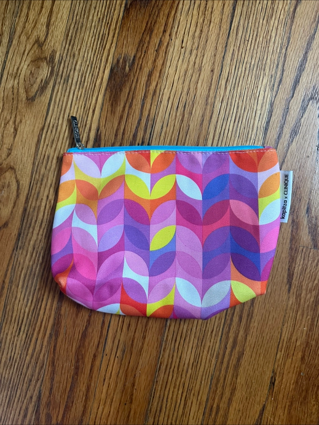 Here's a cute and colorful pouch from the collaboration between Clinique and KOPITRO! It's in great condition and perfect for storing your makeup or small essentials. The pouch measures approximately 7 inches in height and 9.5 inches in width. The bright, geometric pattern is sure to add a pop of color to your bag!