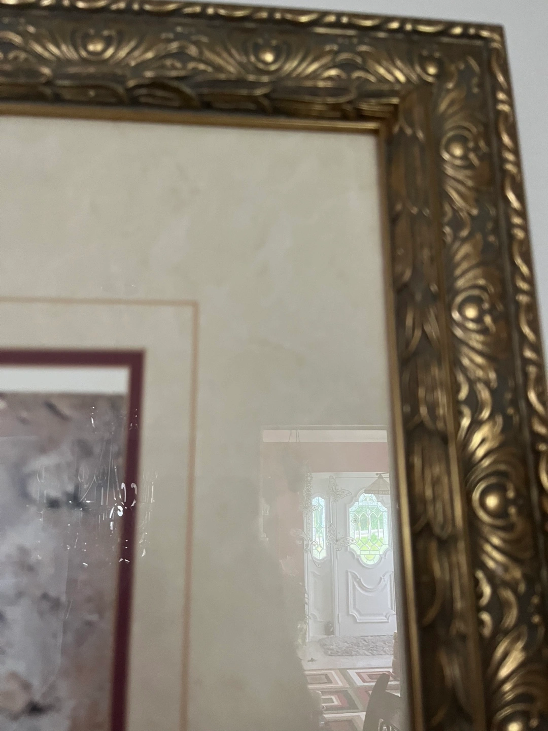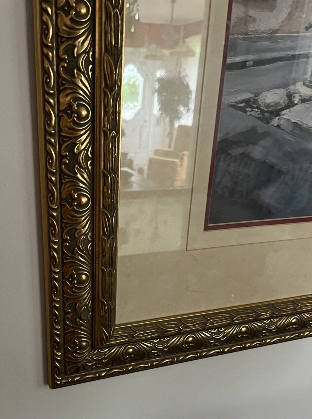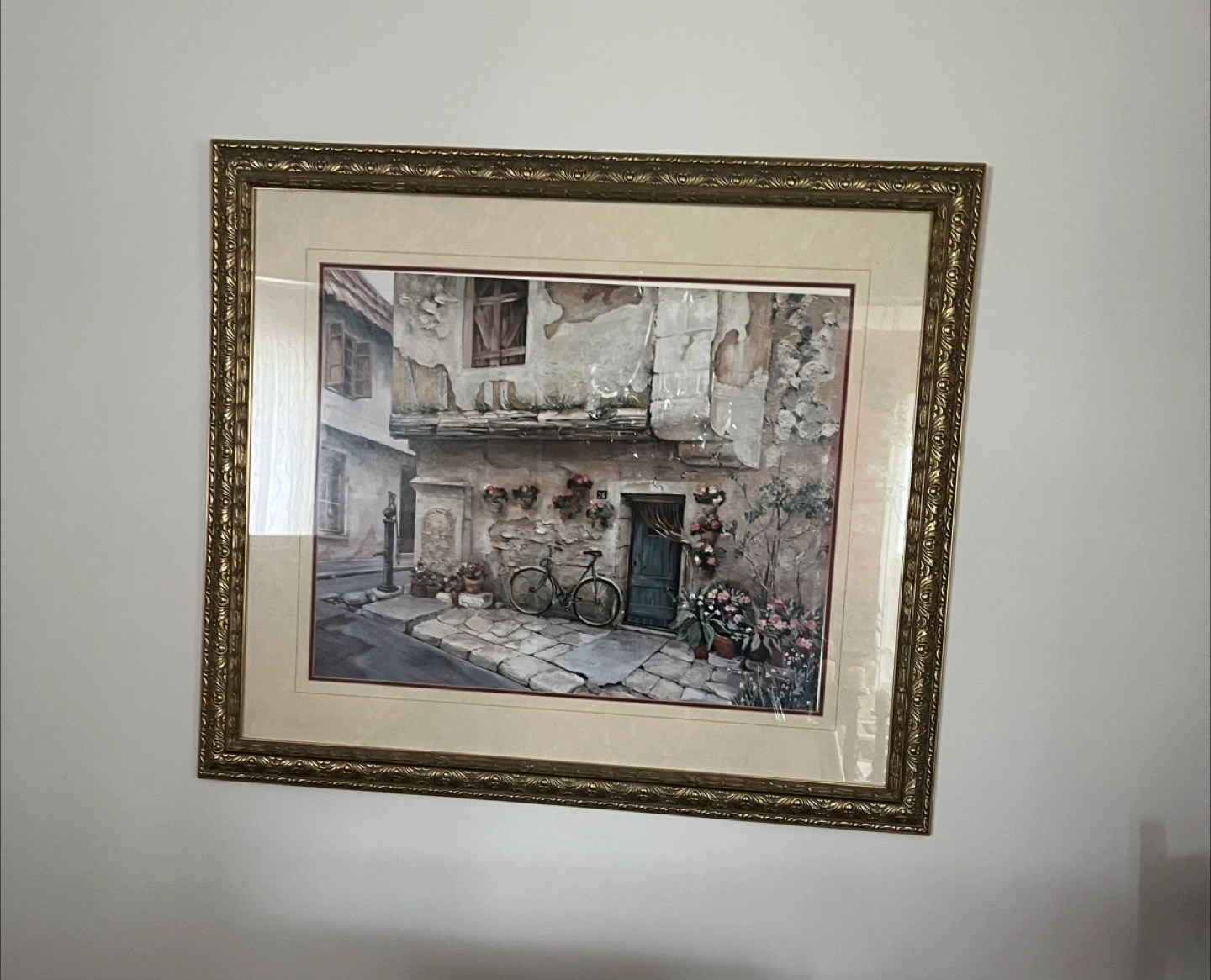 This is a lovely framed print, perfect for adding a touch of old-world charm to your home. The print depicts a quaint European street scene with a bicycle parked in front of a weathered building. The frame has an ornate, antique gold finish that complements the artwork beautifully. It's in great condition and ready to hang!