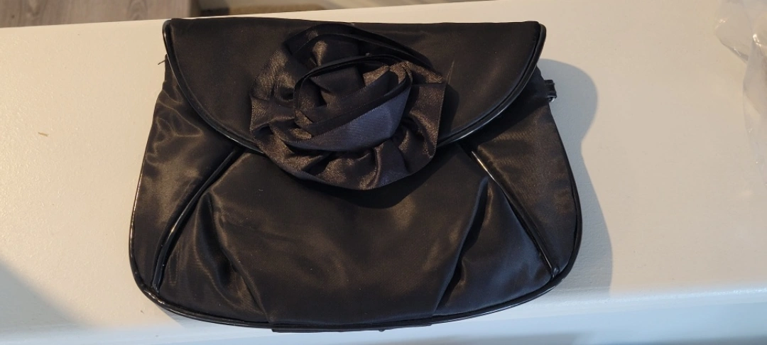 Selling a stylish black clutch purse. It features a lovely floral detail on the front and a convenient wrist strap. Perfect for evenings out or special occasions.