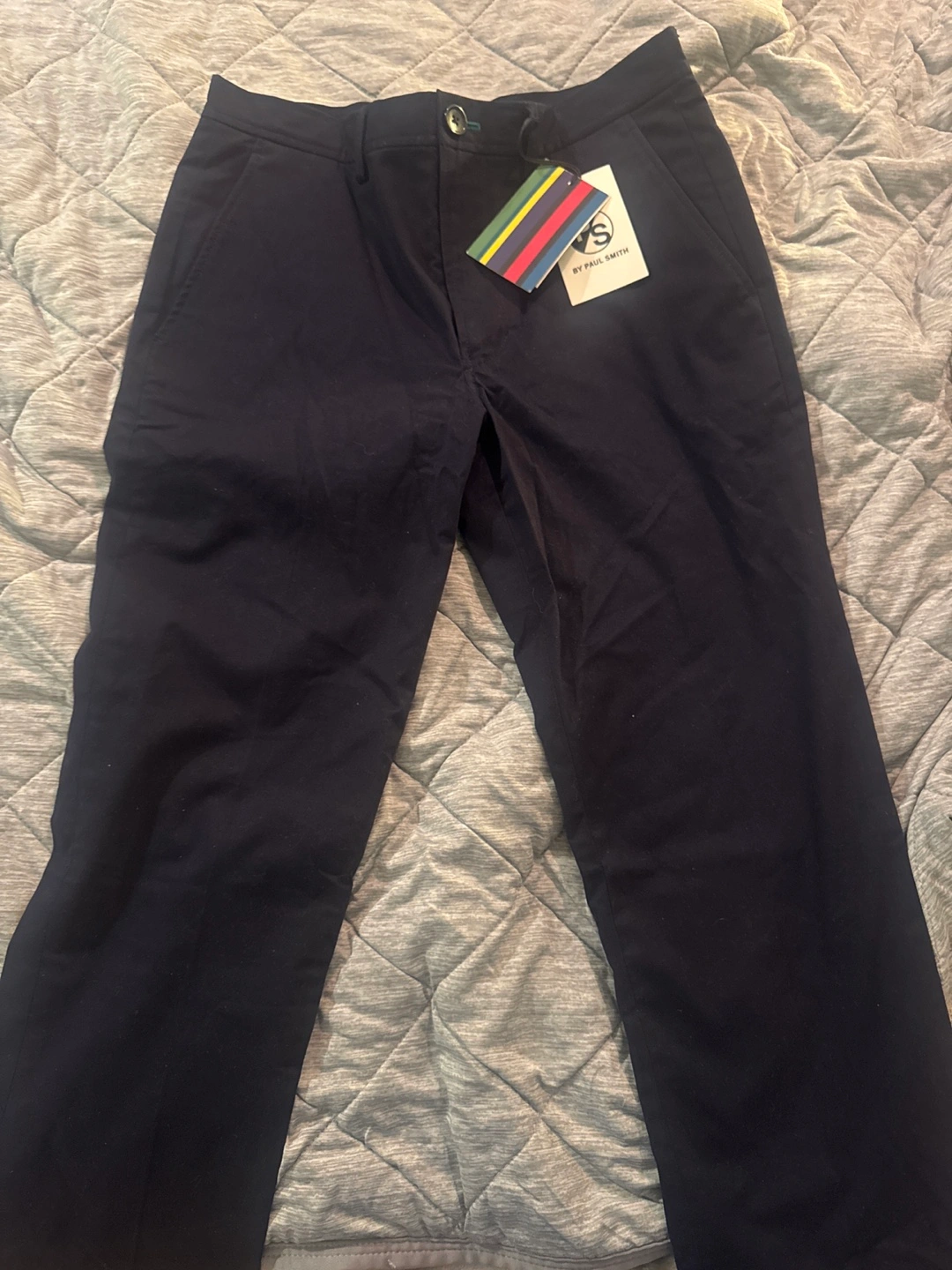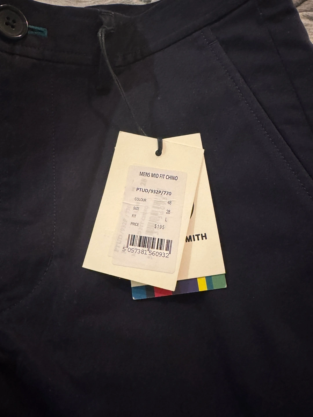 Paul Smith Mens Mid Fit Chino pants. They are size 28 and navy in color. The tag shows the color as 48 and the model number is PTLD/932P/770. Originally priced at $195