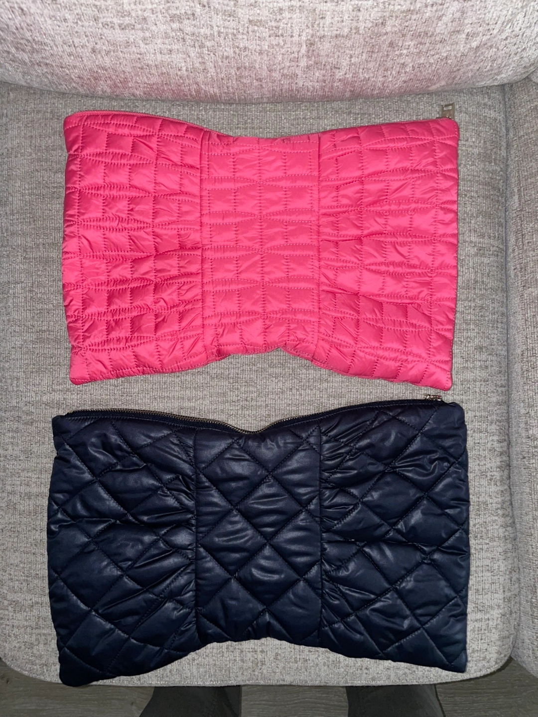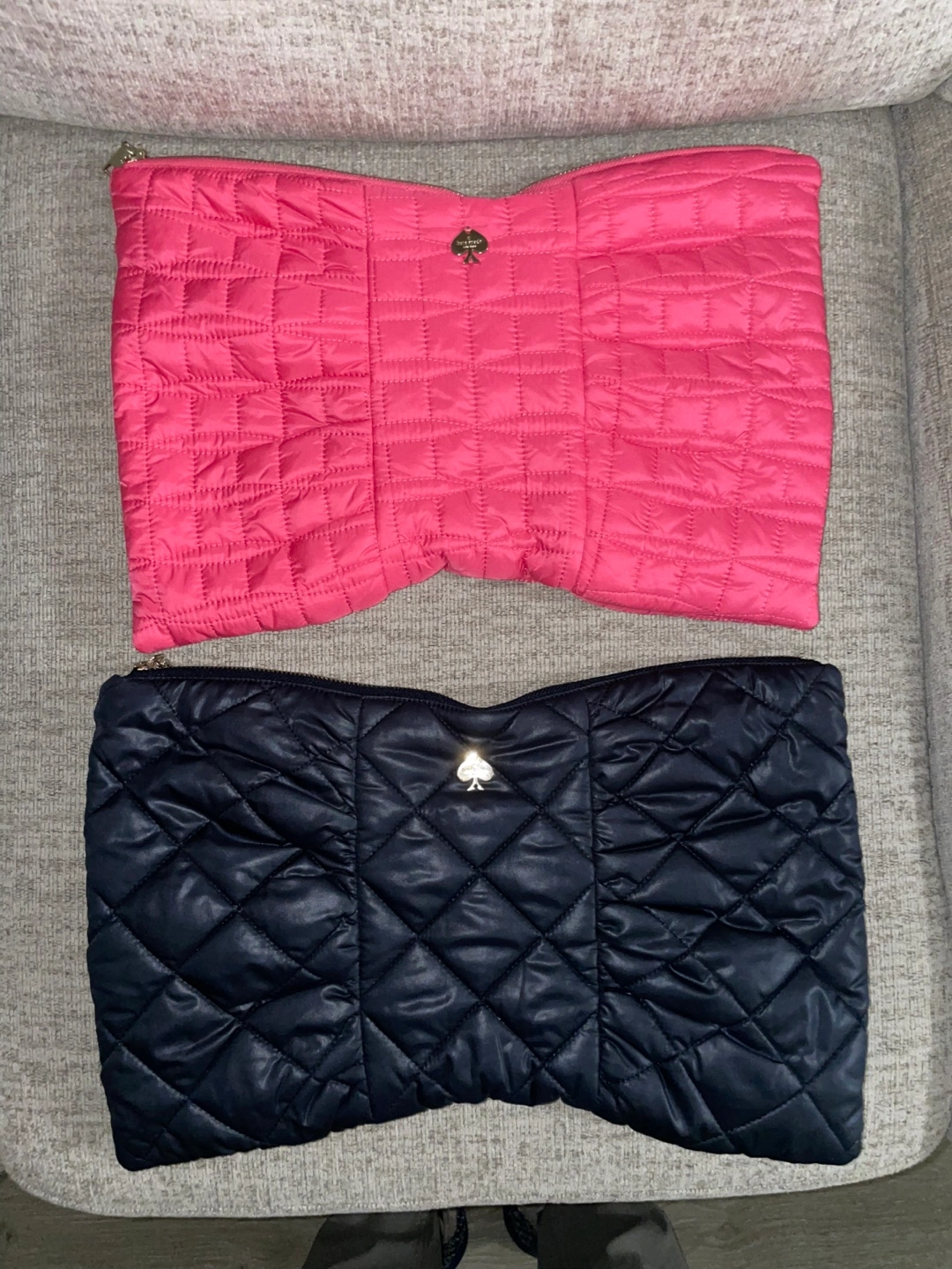 Here are two cute Kate Spade quilted pouches! One is pink and the other is navy. Perfect for storing makeup, toiletries, or other small items. They are in great condition and ready for a new home
