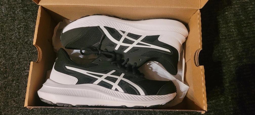 Selling a pair of ASICS Women's Running Shoes in black and white. They are a US size 7 and wide width. Comes with the original box.