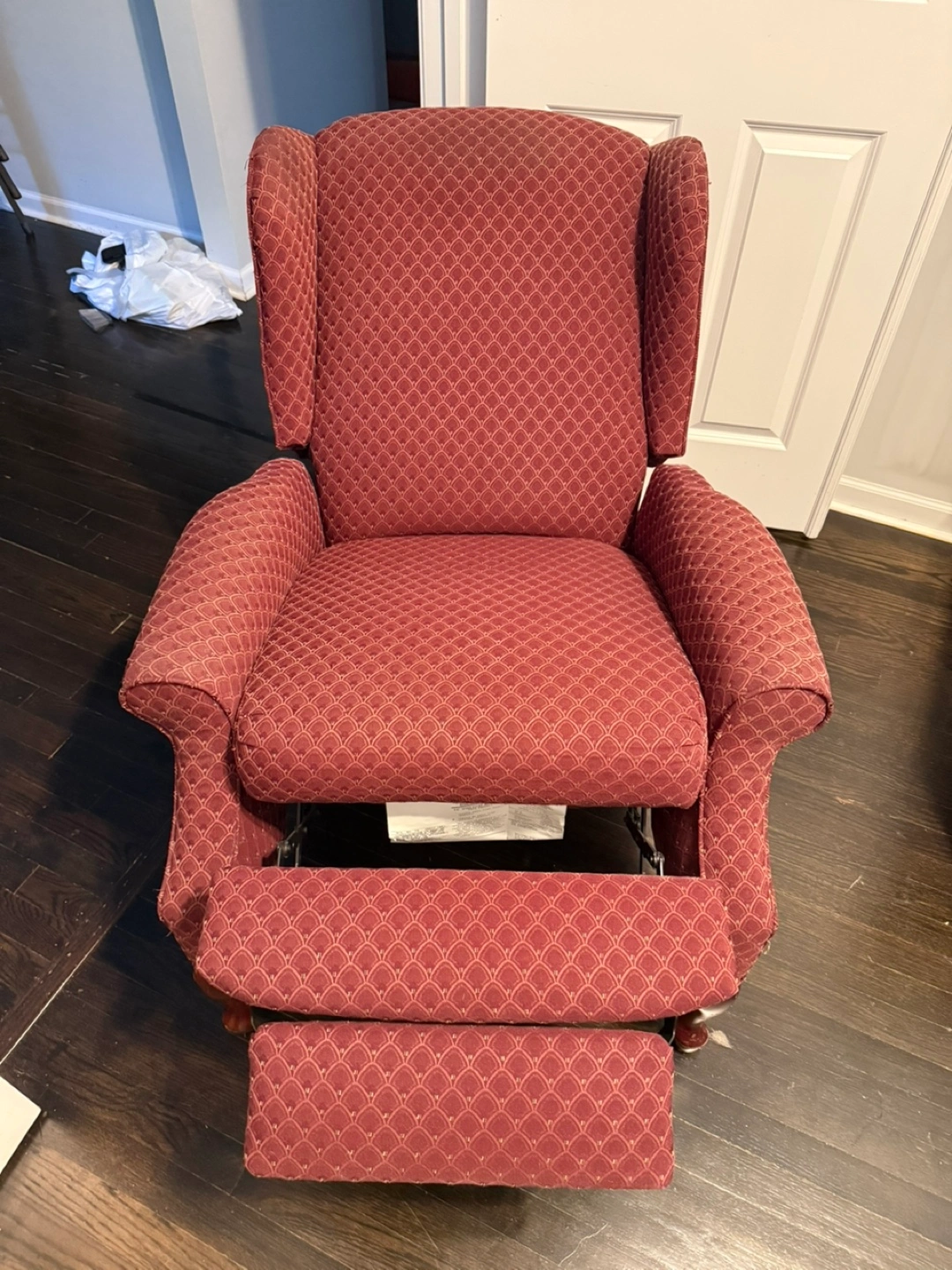 Comfortable burgundy wingback recliner chair in good condition. Perfect for relaxing and unwinding after a long day! The chair features a classic wingback design and a reclining function for added comfort