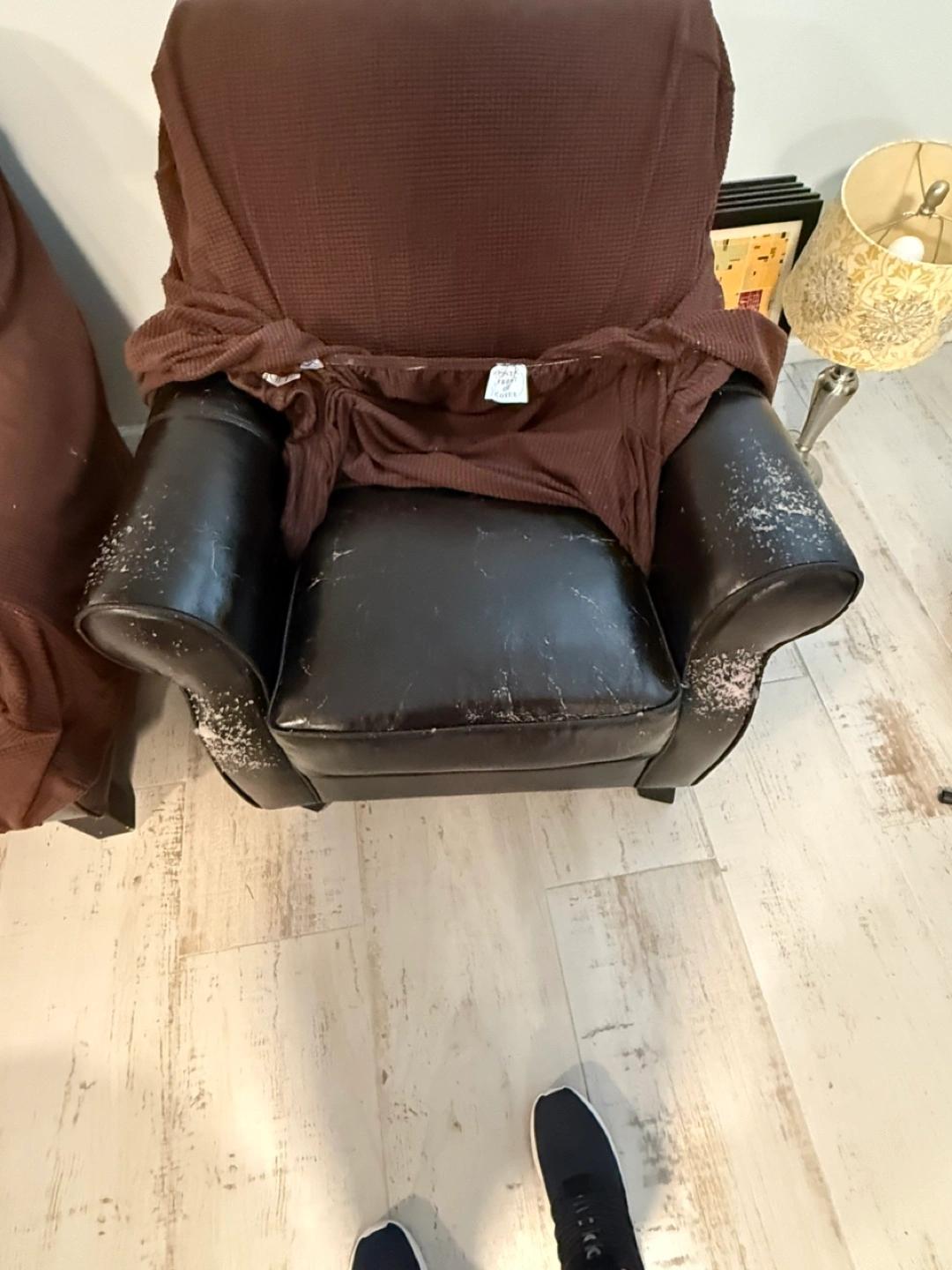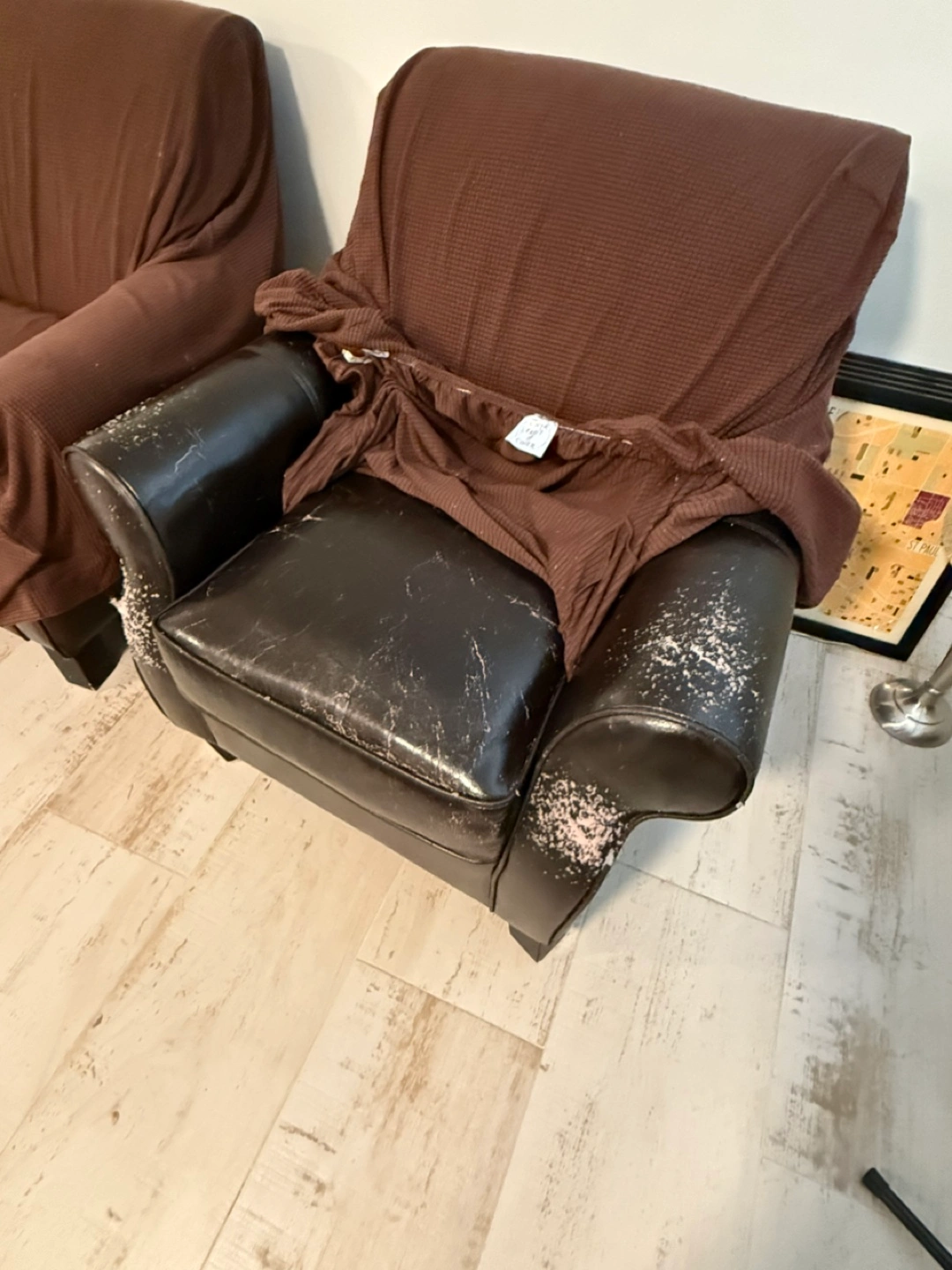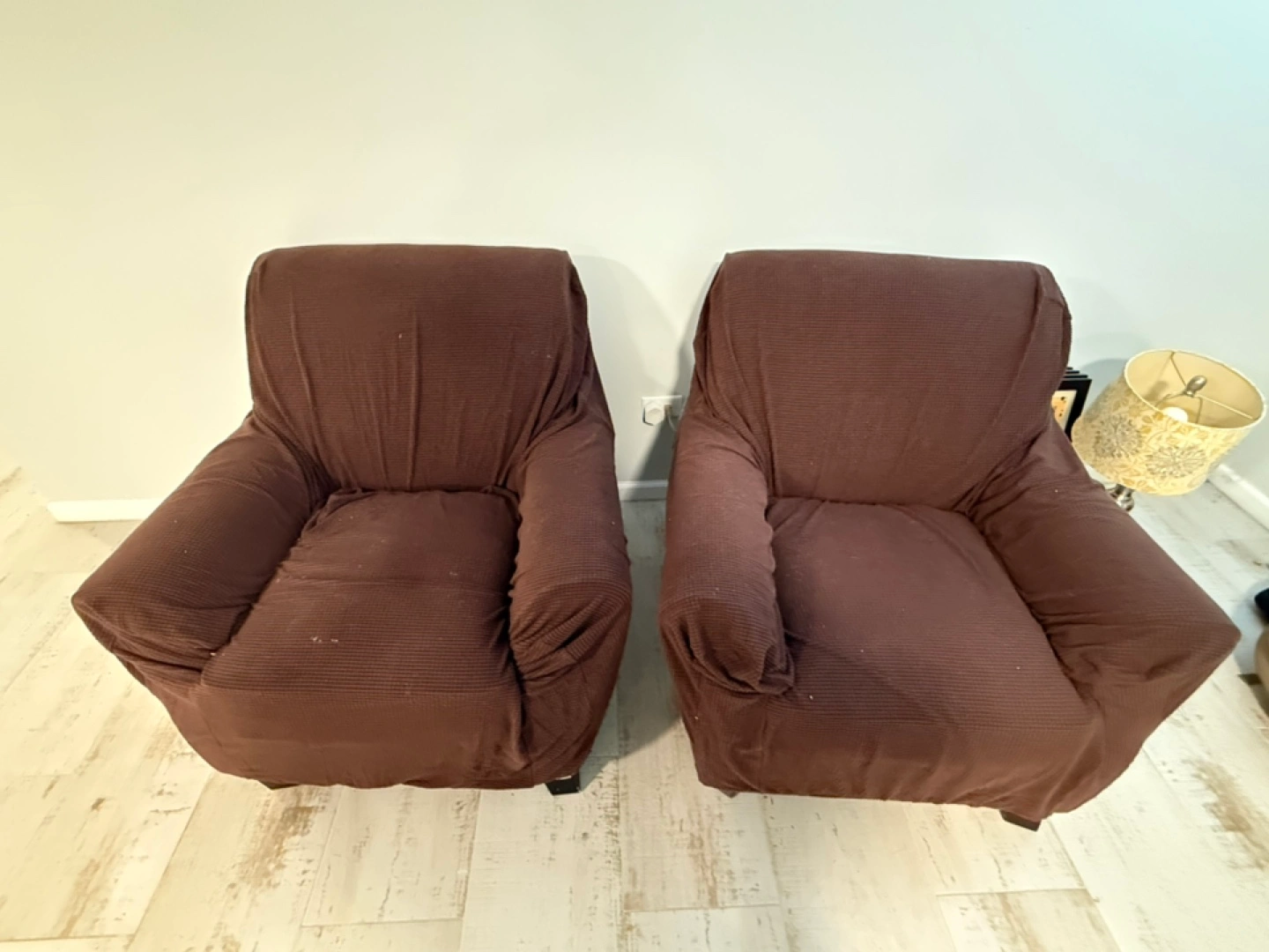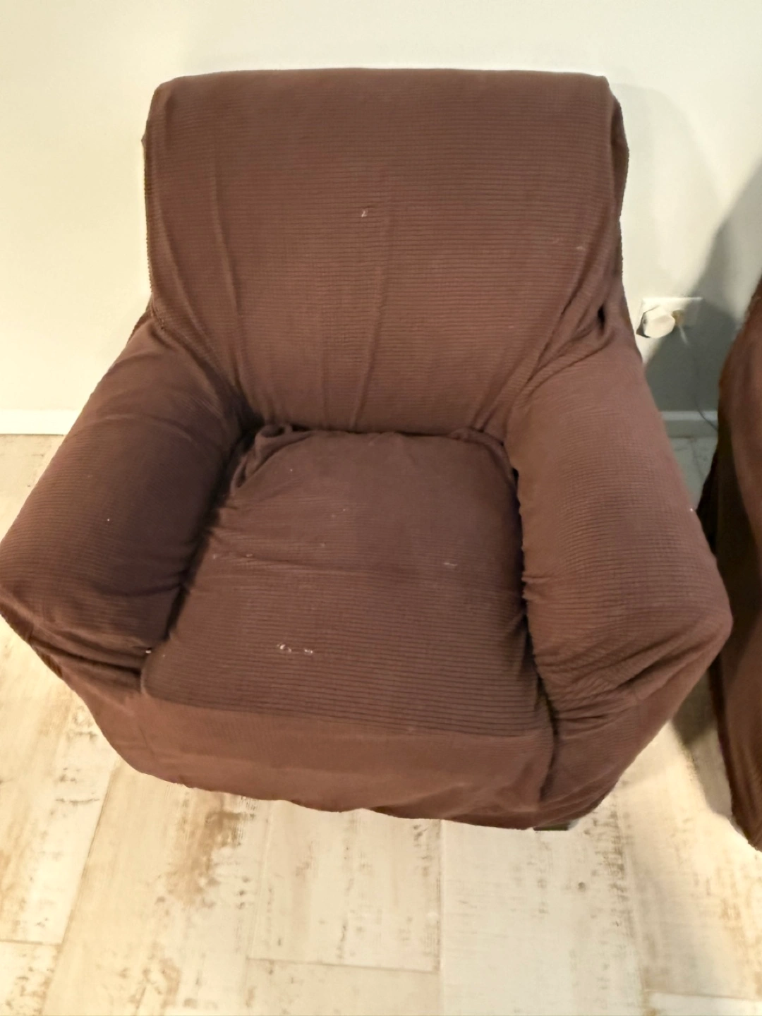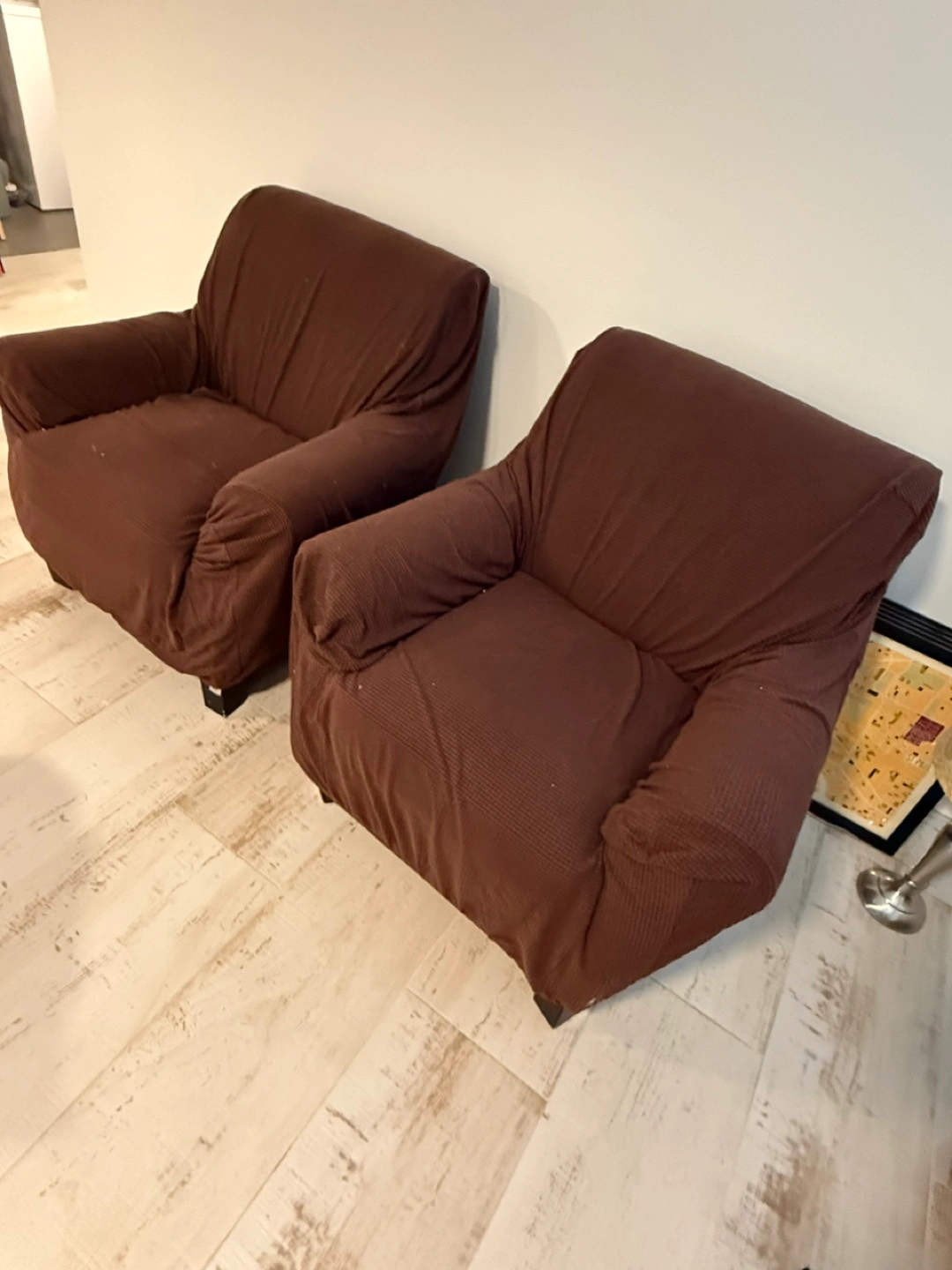 Selling a set of two comfortable armchairs with brown covers. These 2 pleather chairs from Target show some signs of wear, but are still comfortable and functional. Great for a basement, garage or porch.
