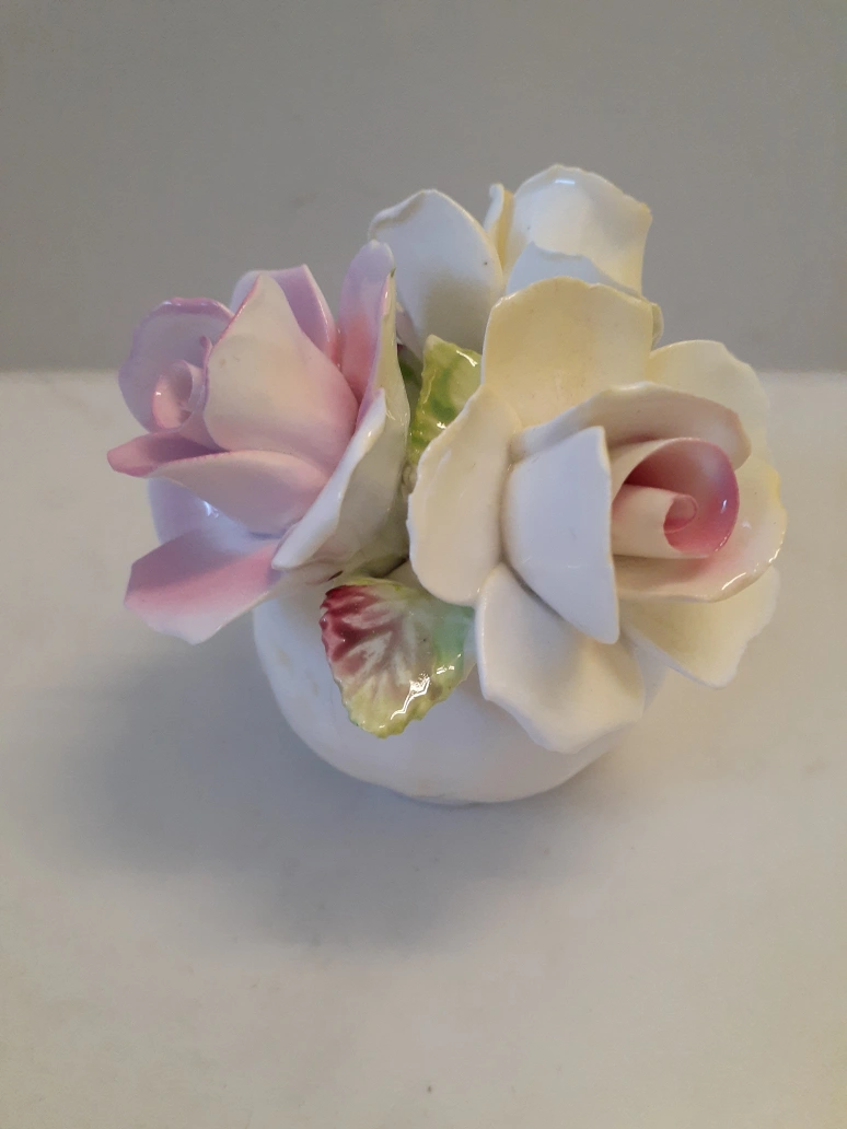 Beautiful Royale Stratford Fine Bone China flower arrangement. This lovely piece features delicate pink, white and yellow roses in a small vase.