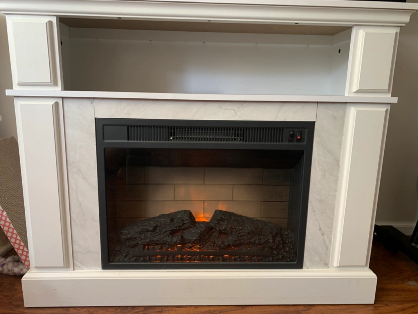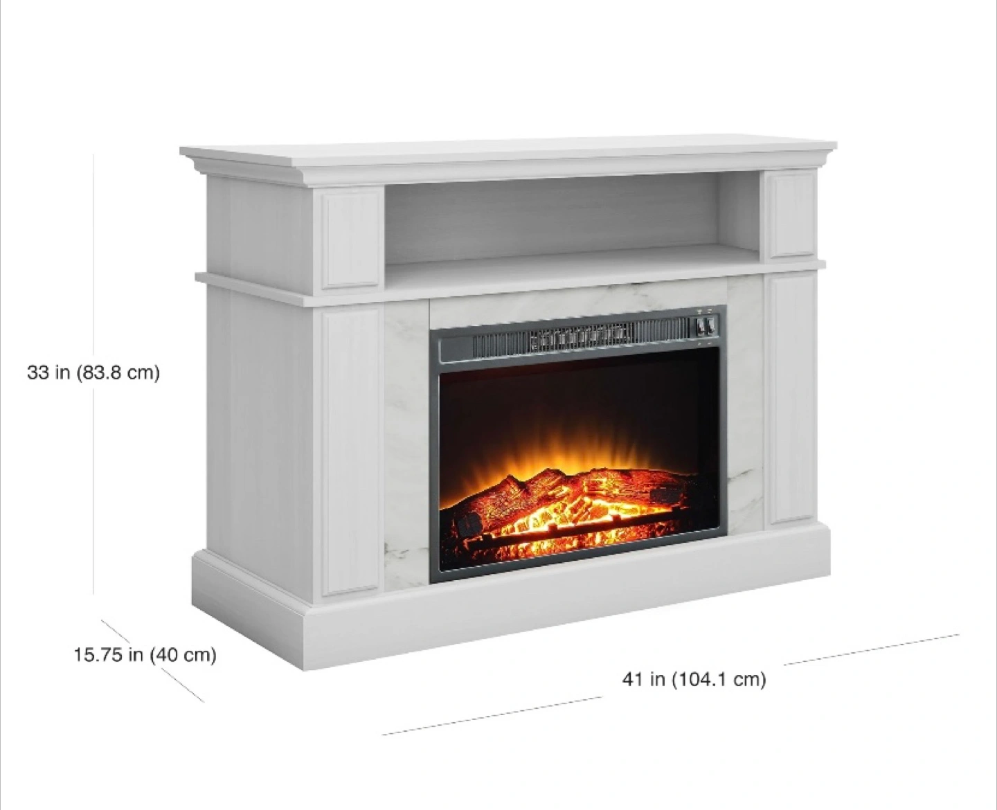 I'm selling a beautiful white electric fireplace TV stand! It adds a cozy ambiance to any room. It measures 33 inches in height, 41 inches in width, and 15.75 inches in depth. Perfect for those chilly evenings!
