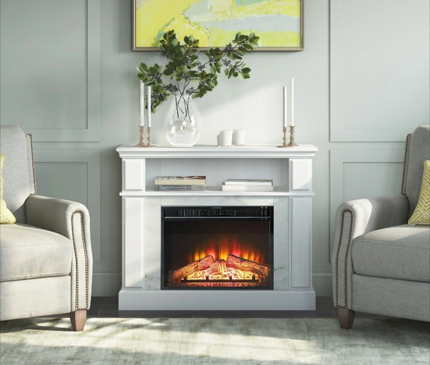 Warm up your home with the Mainstays Media Console with Electric Fireplace. The 23-inch energy-efficient fireplace insert heats up to 400 sq. ft. Enjoy realistic ember and flame effects with or without heat year-round.