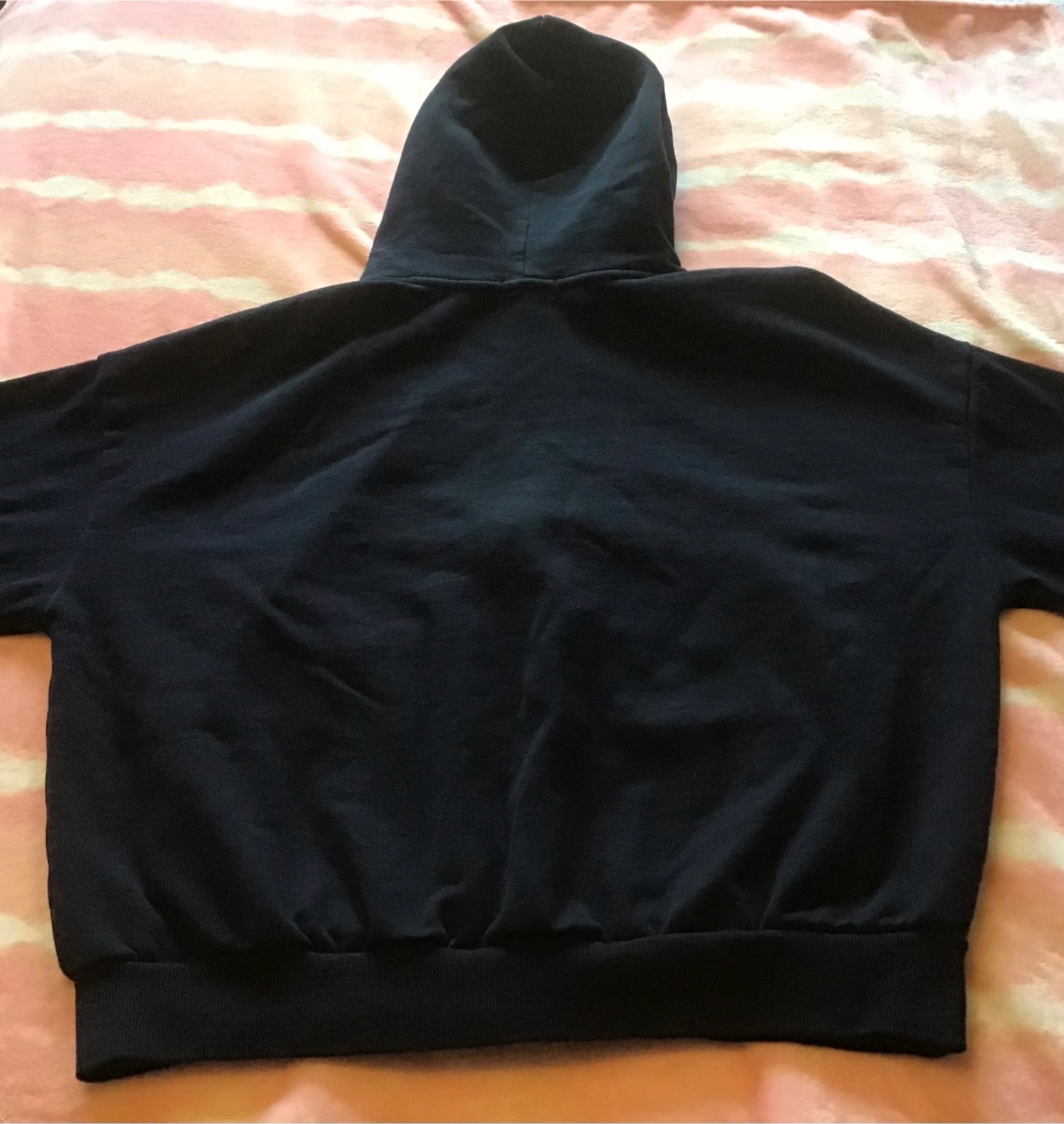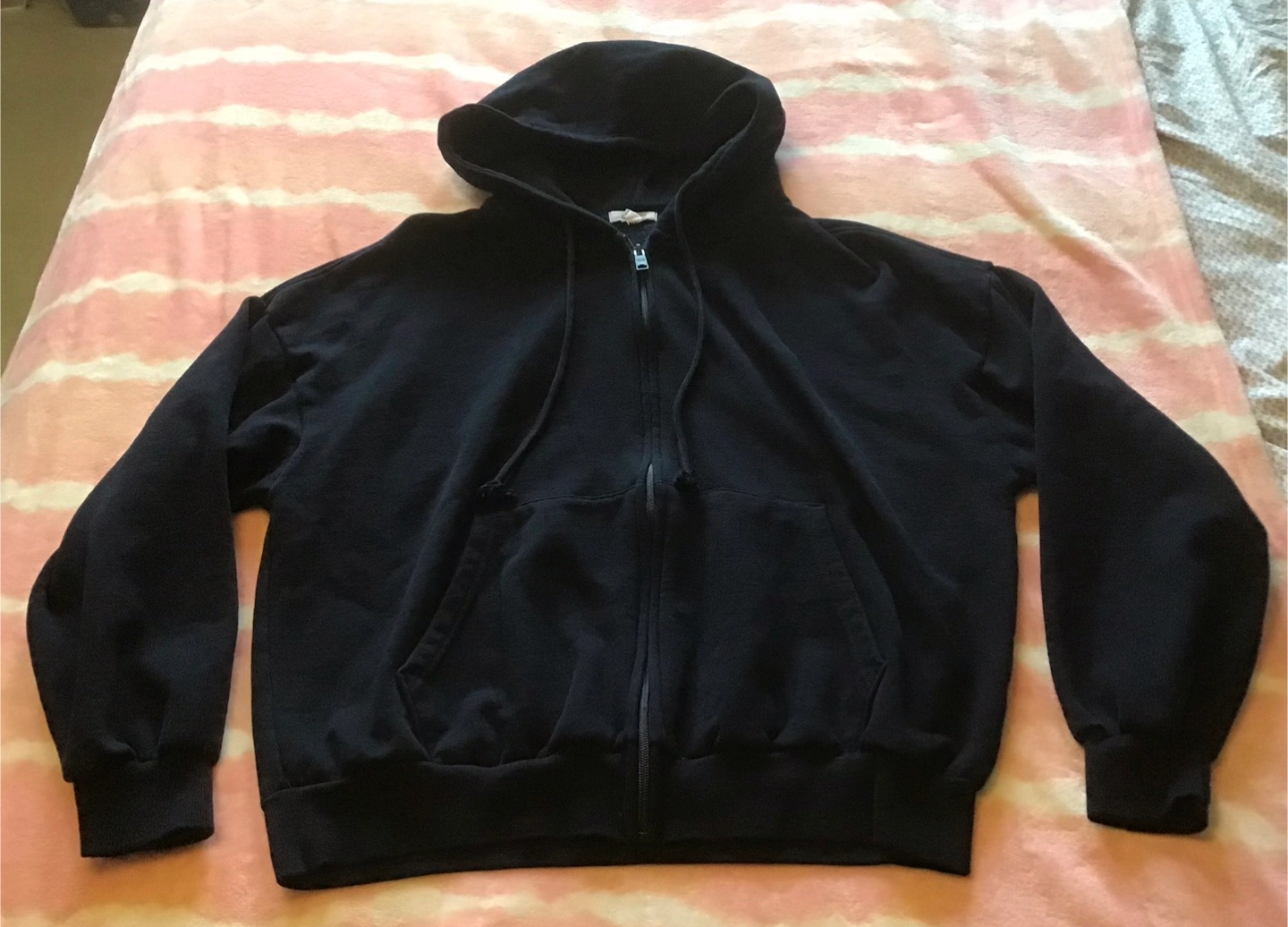 Selling a navy blue zip-up hoodie. It's in good condition and perfect for layering or just lounging around. Super comfy and a classic piece! 🤩