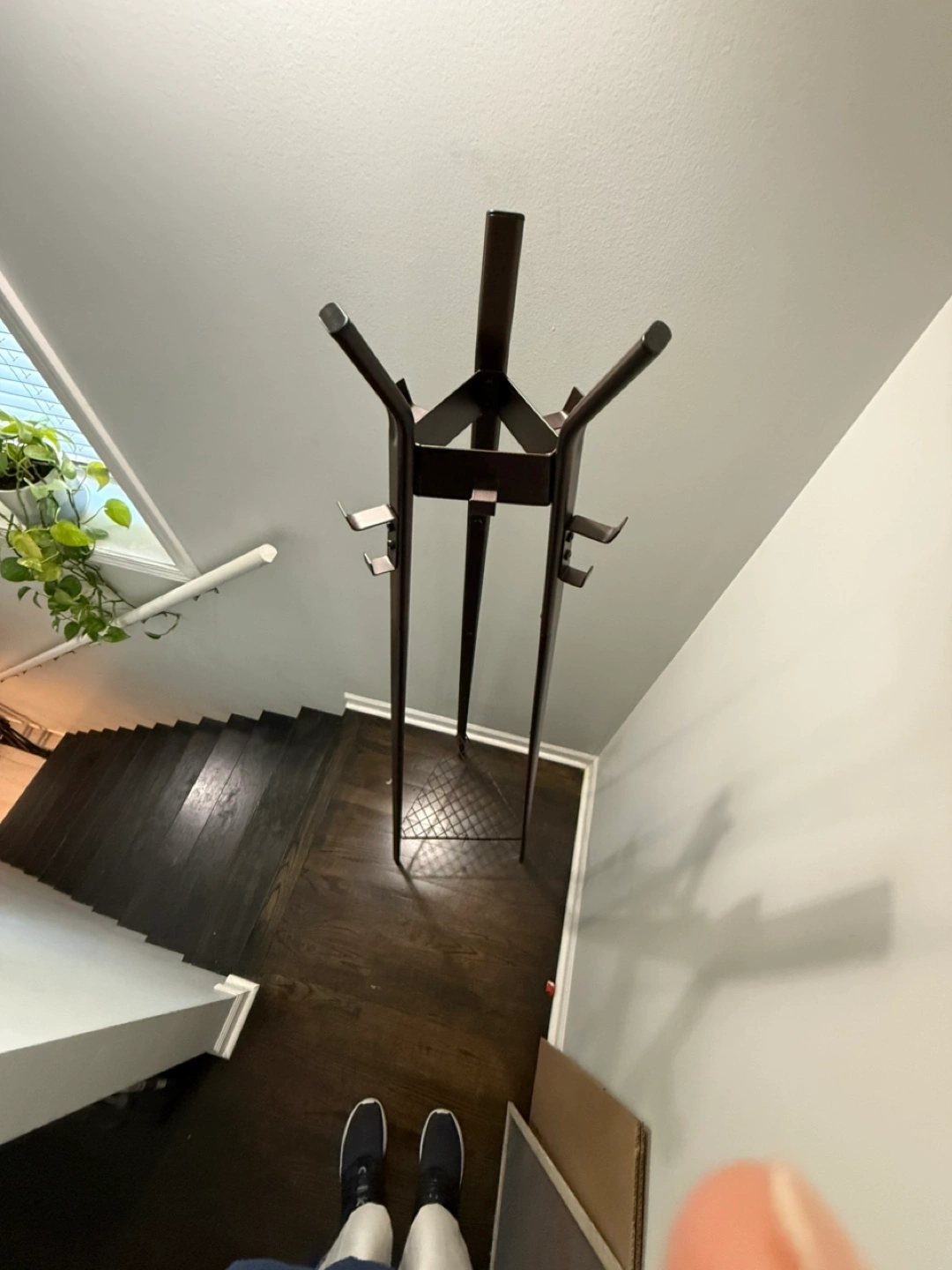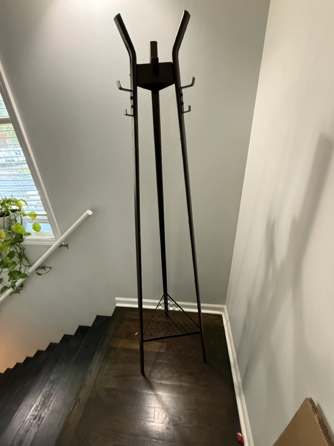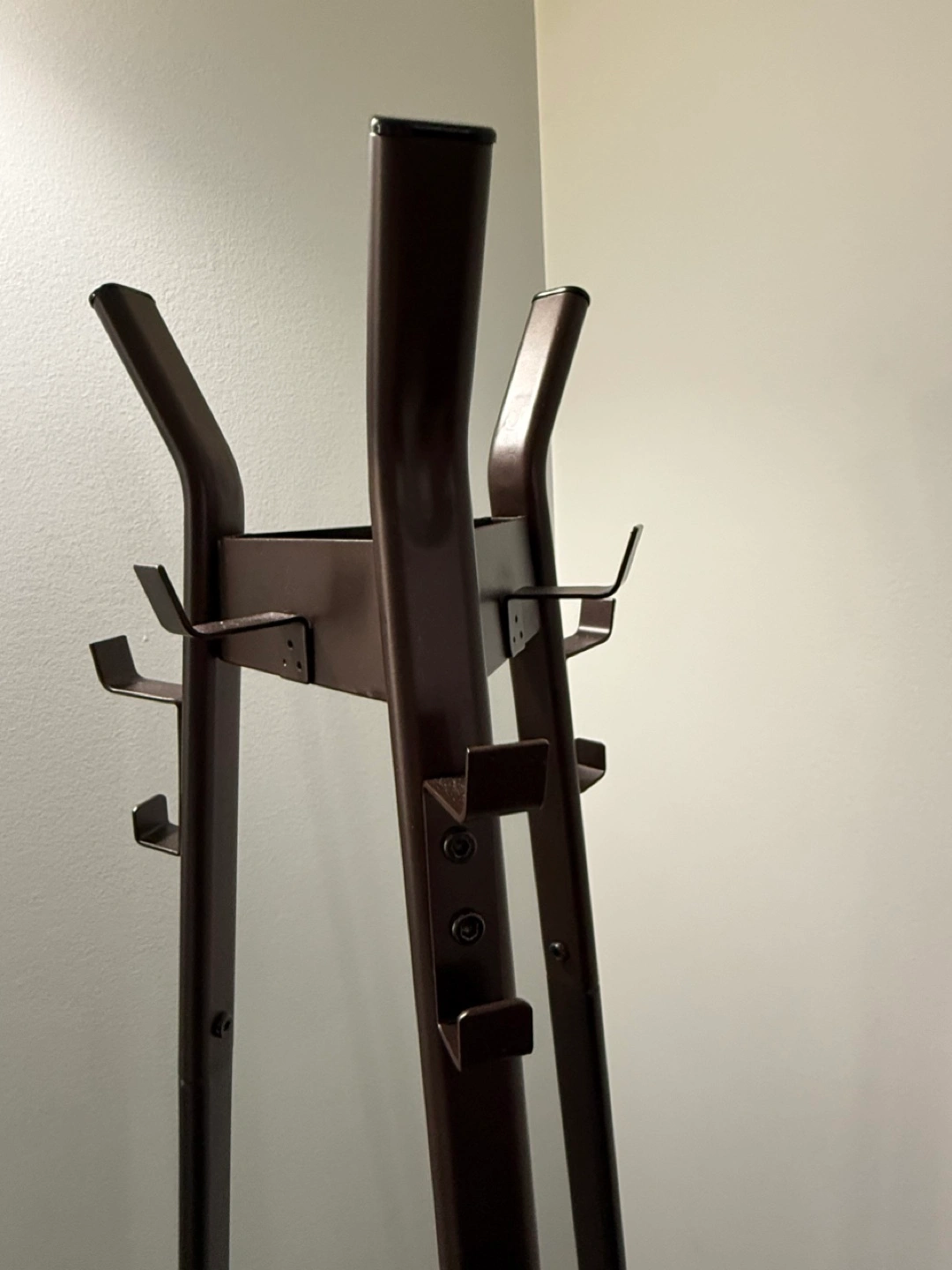 Here's a brown metal coat rack stand! It's perfect for keeping your coats and hats organized. It has a sturdy base and multiple hooks for hanging items. It's in great condition and ready for a new home