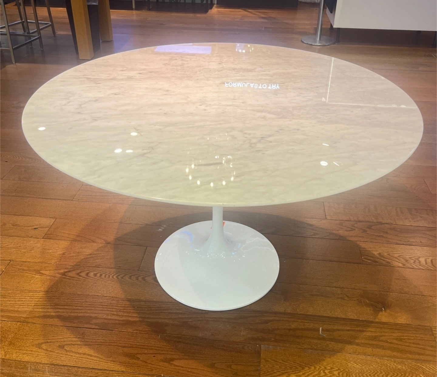 Selling a round dining table with a marble top and white base. It's in great condition and would be a lovely addition to any dining space!