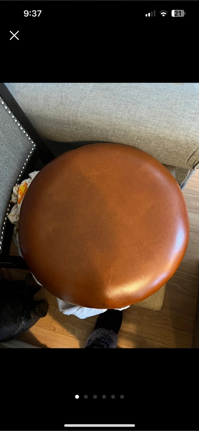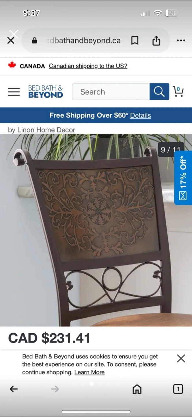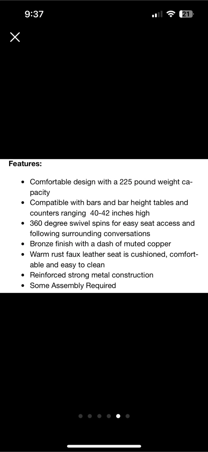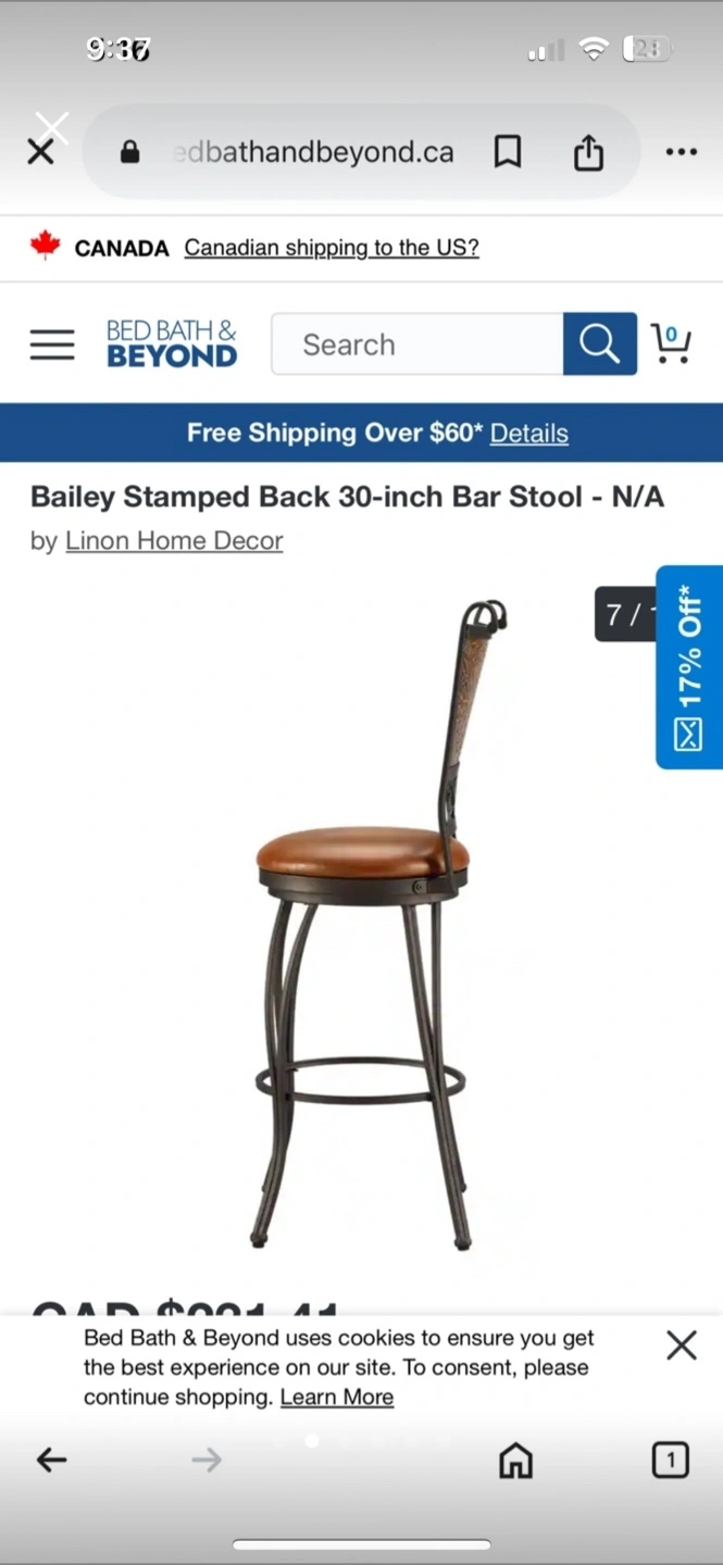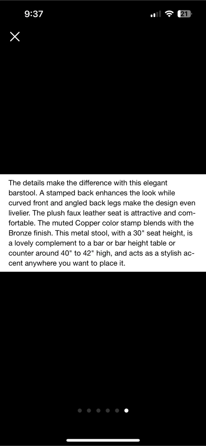 This is a Linon Home Decor Bailey Stamped Back 30-inch Bar Stool. The details make the difference with this elegant barstool. It has a stamped back which enhances the look while curved front and angled back legs make the design even livelier. The plush faux leather seat is attractive and comfortable. The muted Copper colour stamp blends with the Bronze finish. Retails for $231.41 CAD EACH + taxes delivery $500+