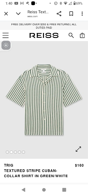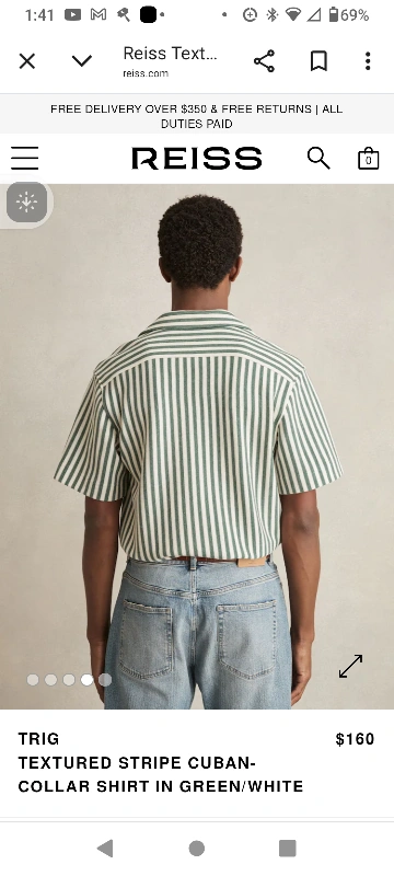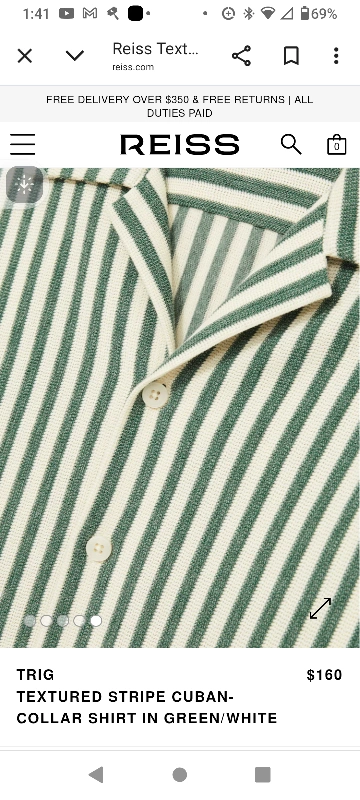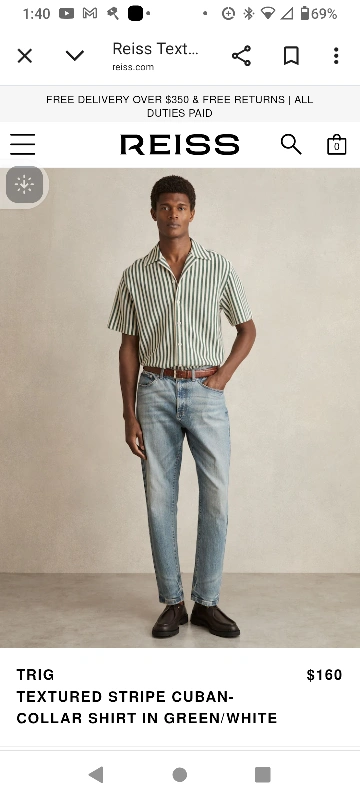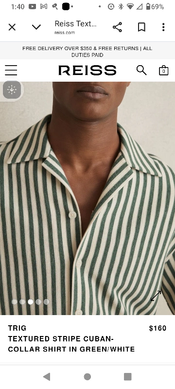 Selling a Reiss TRIG textured stripe Cuban-collar summer shirt in green and white. This stylish shirt originally retailed for $160. It features a unique textured stripe pattern and a comfortable Cuban collar, perfect for a casual yet refined look