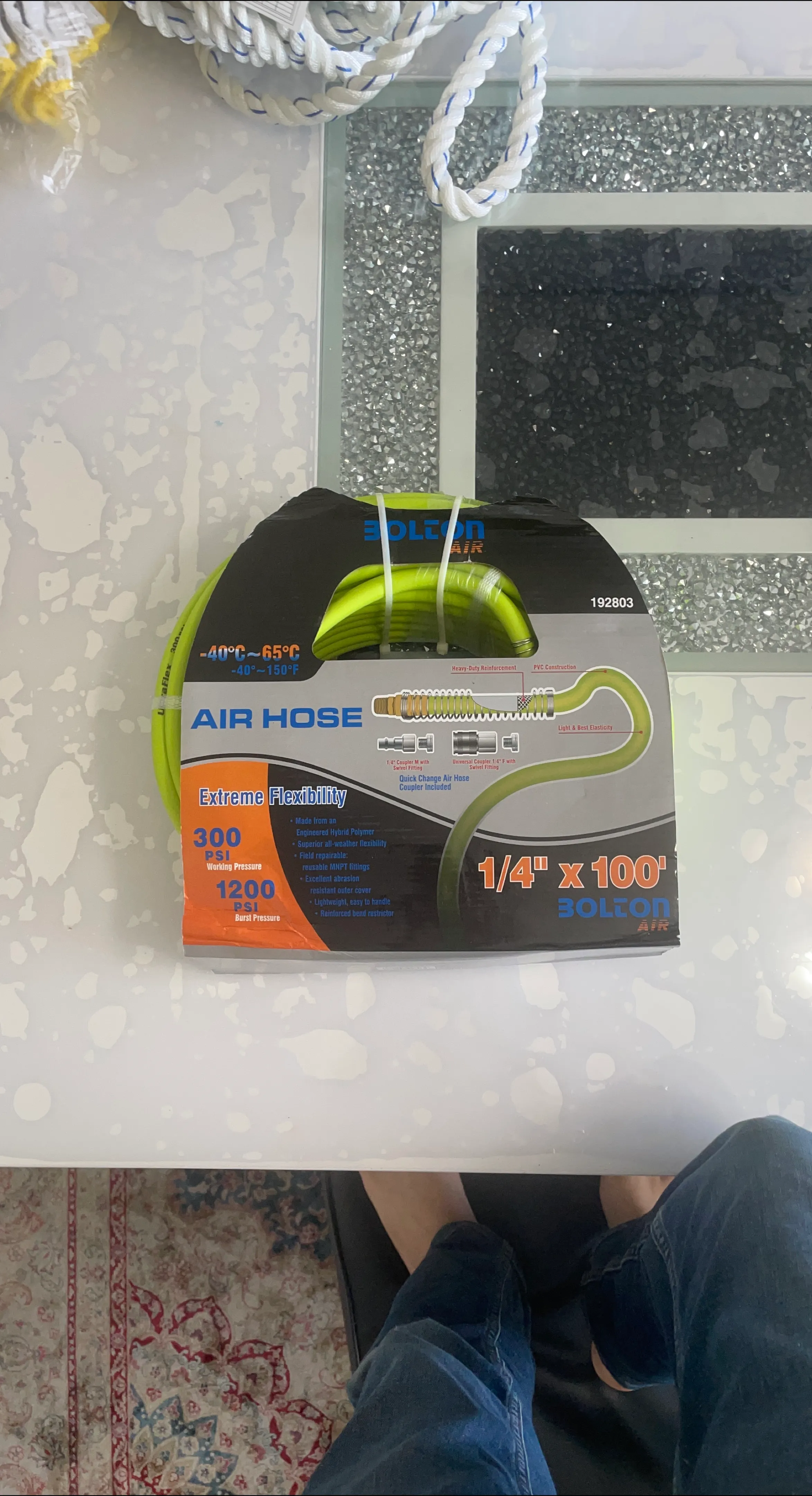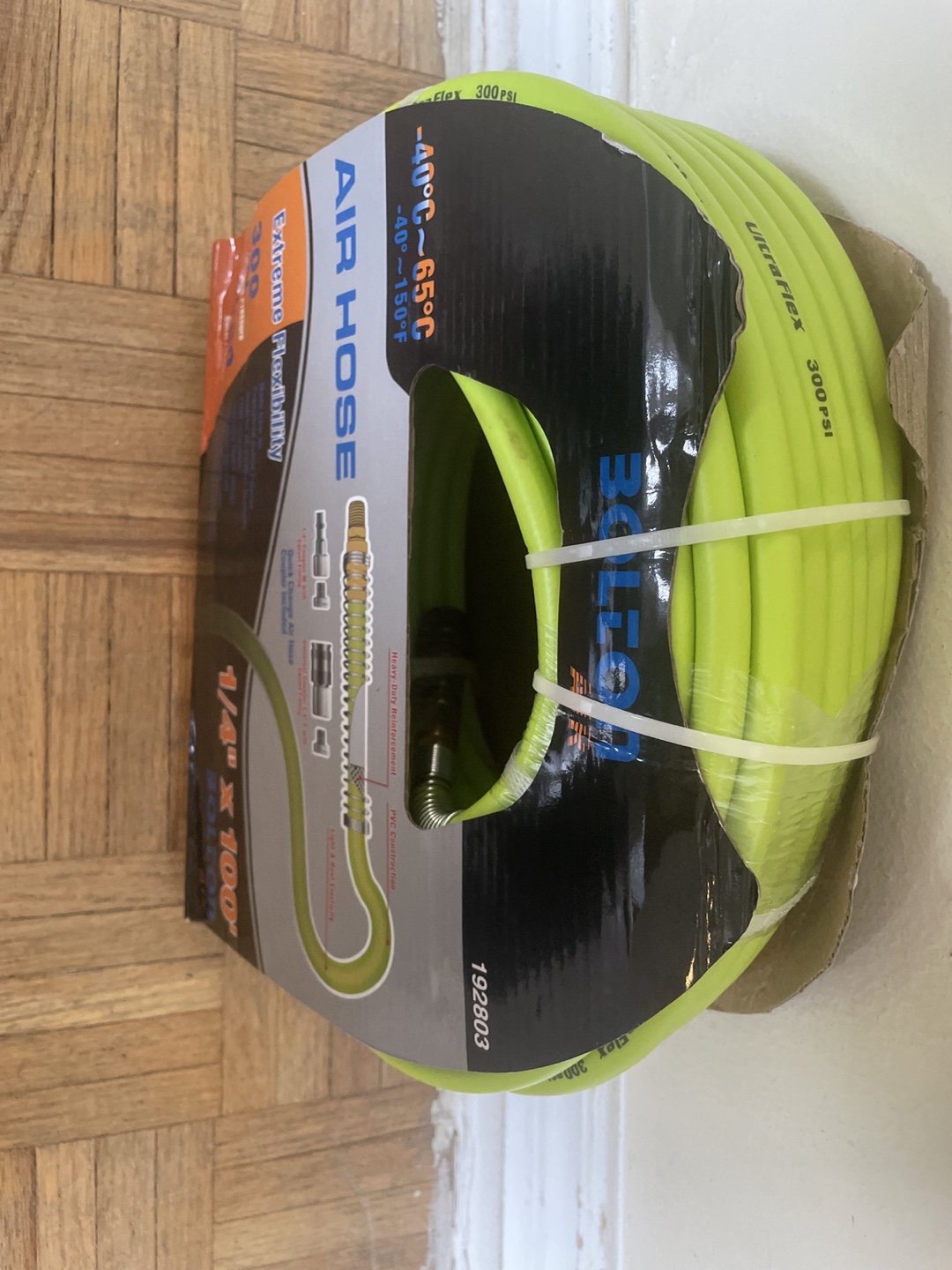 Selling a brand new Bolton Air 1/4" x 100' air hose! This hose features extreme flexibility and is made from an engineered hybrid polymer. It's super abrasion resistant and lightweight, with an easy-to-handle design. Also features reusable MNPT fittings and a reinforced bend restrictor