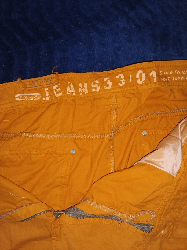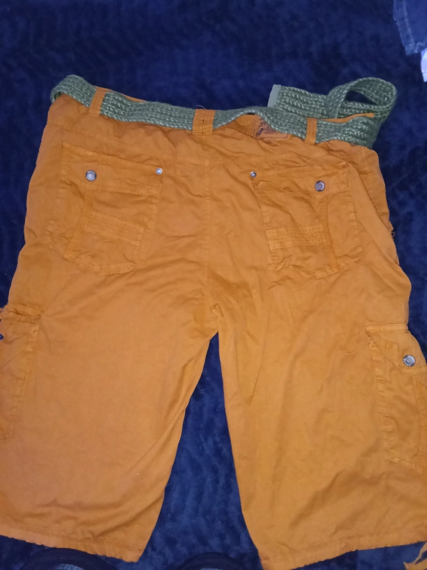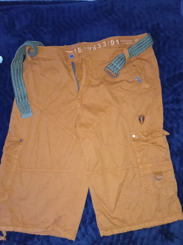 These Stone Touch Jeans 33/01 cargo shorts come in a unique orange color. They feature a comfortable fit and a stylish design, perfect for casual wear. The shorts have multiple pockets for convenience and a belt for added flair. They're made from durable materials, ensuring long-lasting use.