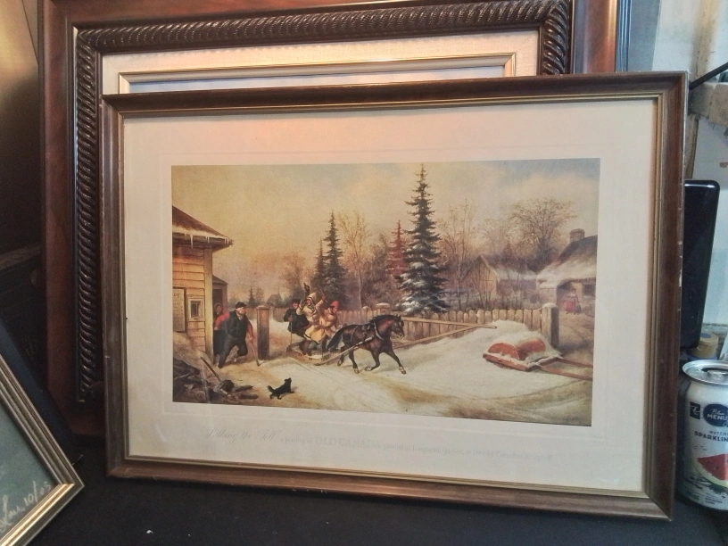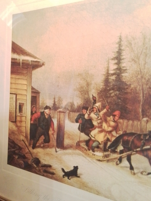 I'm offering an antique framed art print titled "Bilking The Toll" by Cornelius Krieghoff, measuring 21 inches. It is a beautiful piece of Canadian historical art, showcasing a winter scene with vibrant colours and intricate details. This print captures a lively moment from early Canadian life, perfect for collectors or anyone looking to add a touch of history to their home.