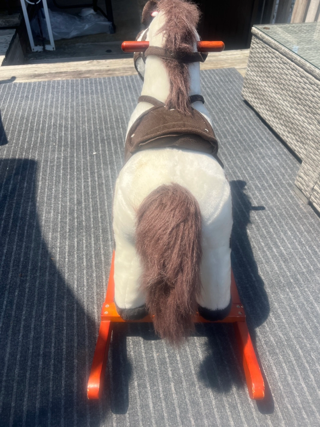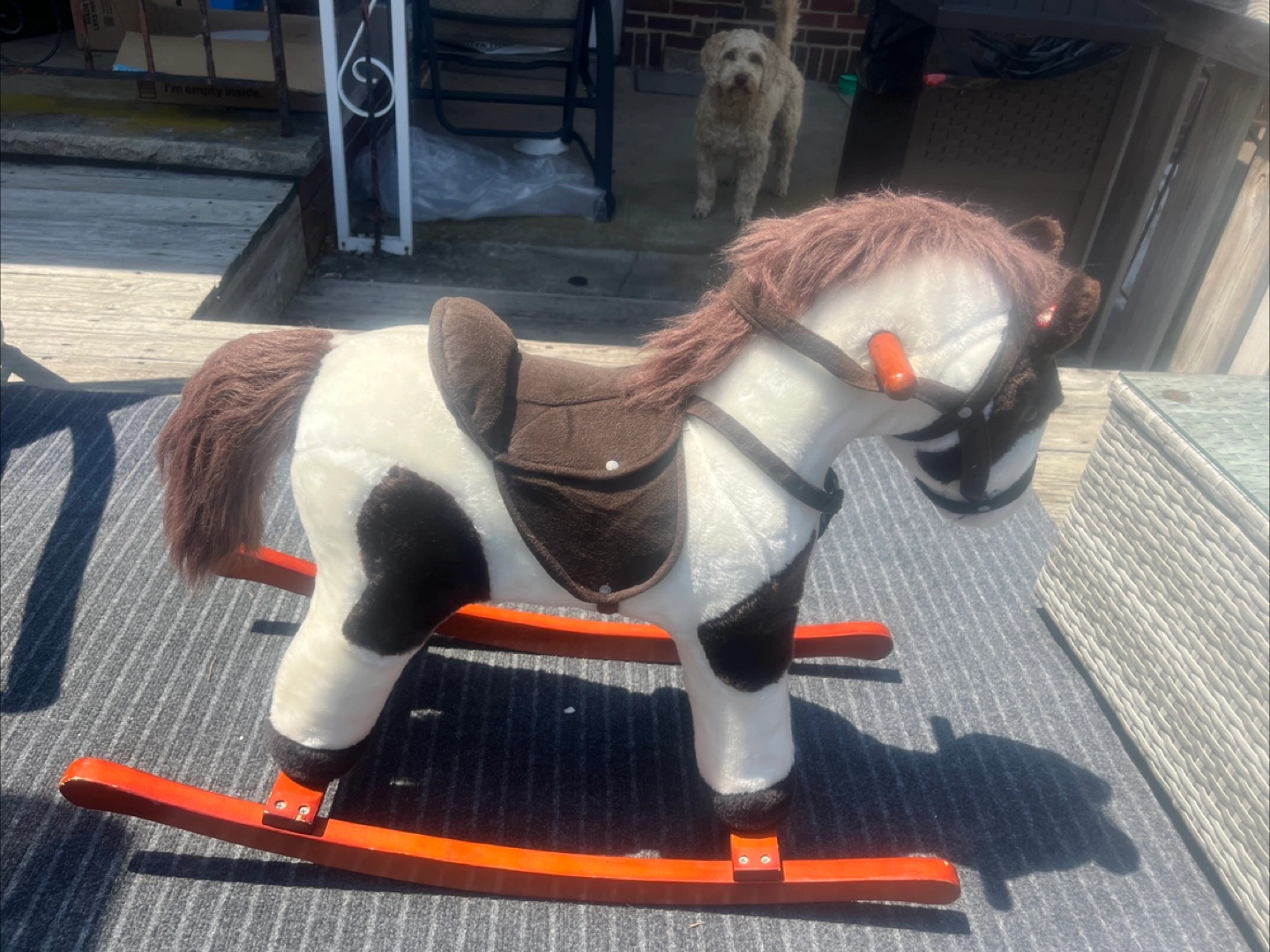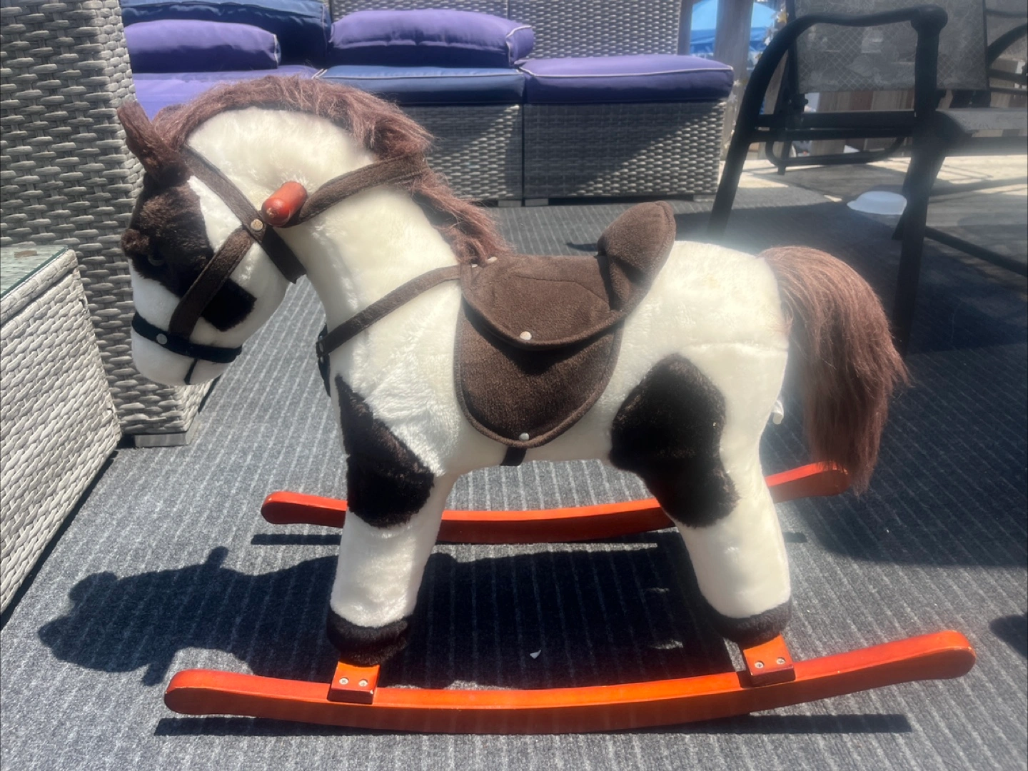 Rocking horse with brown and white details! It's in great shape and ready for a new home. Perfect for toddlers who love horses and cowboys. Makes sounds