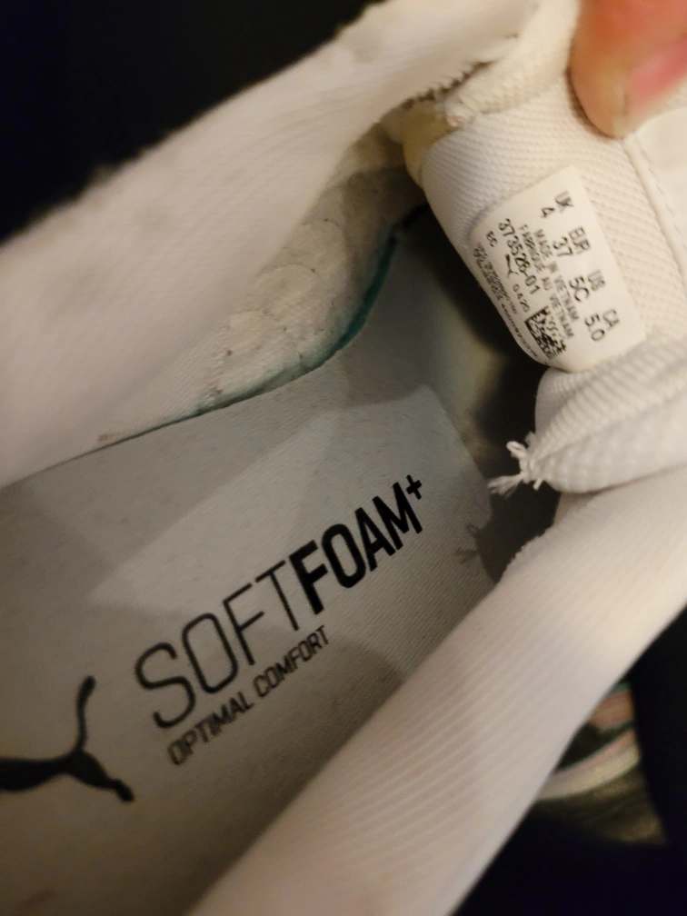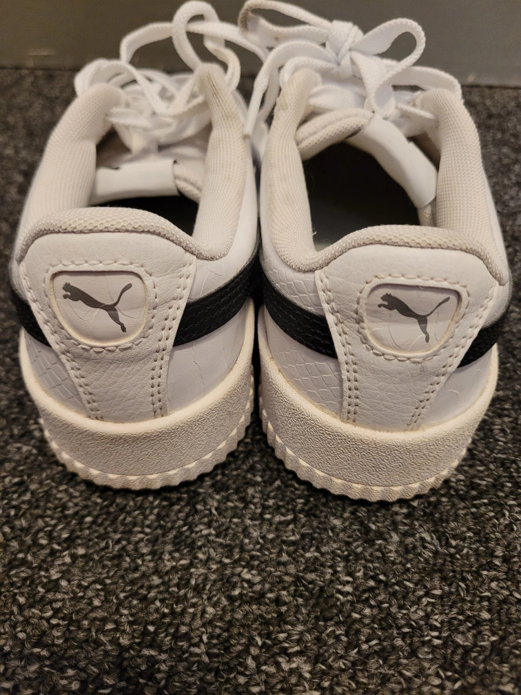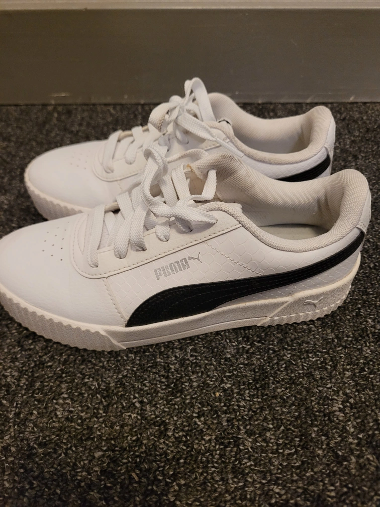 Selling a pair of Puma Carina sneakers in white. They're in good condition and feature Puma's SOFTFOAM+ optimal comfort insole. The size is a youth 5 (US).