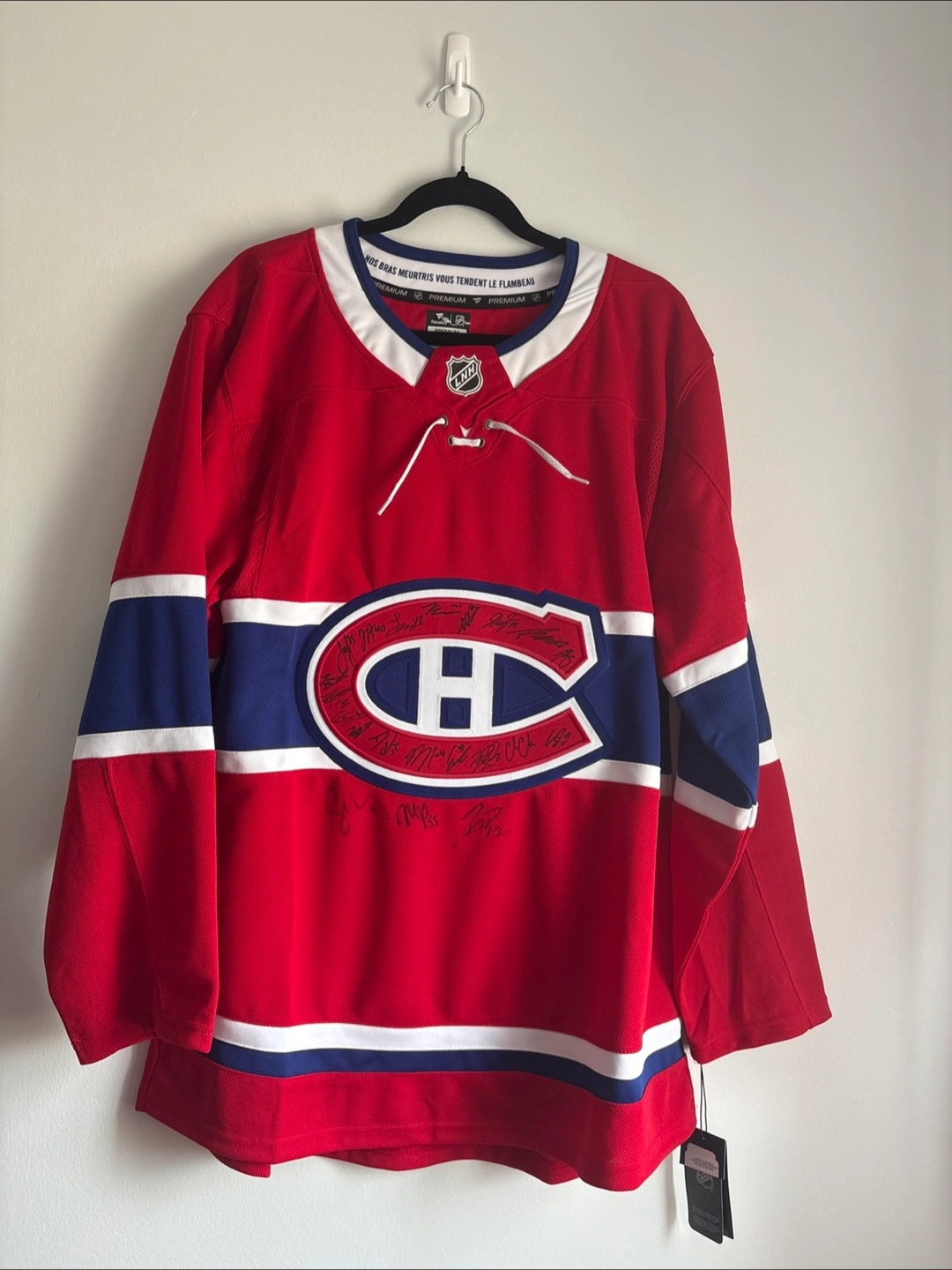 Selling a Montreal Canadiens hockey jersey. It's red with the classic Canadiens logo and features signatures from various players. Great for any Habs fan!