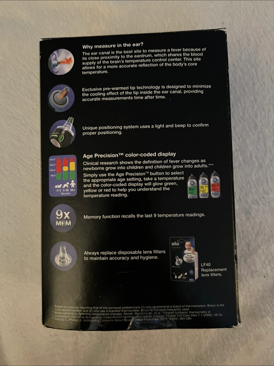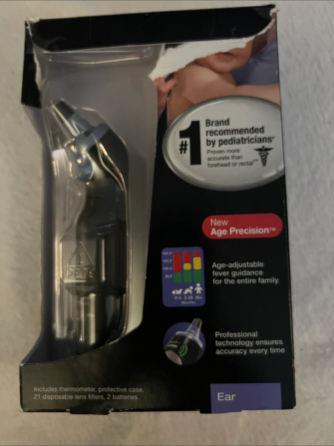 I'm selling a brand new Braun ThermoScan 7 Ear Thermometer! It's still in its original packaging and has never been used. This thermometer is highly recommended by pediatricians for accurate temperature readings, whether forehead or rectal. It features Age Precision technology for age-adjustable fever guidance for the entire family. The professional technology ensures accuracy every time. It includes the thermometer, a protective case, 21 disposable lens filters, and 2 batteries. Open box.