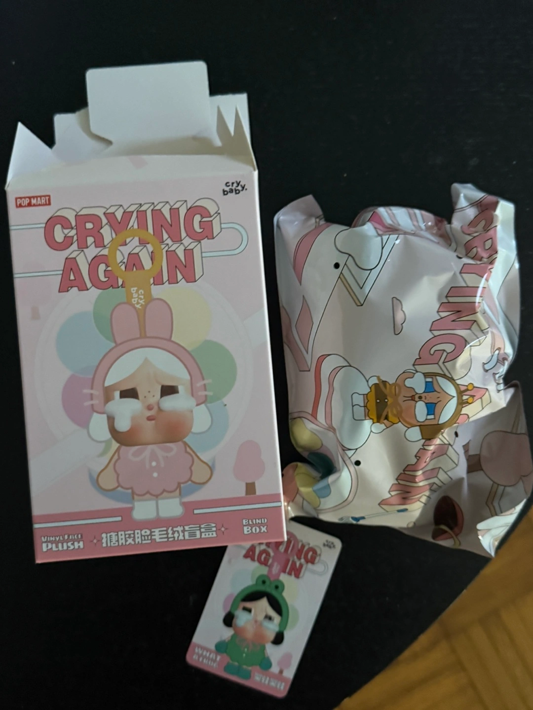 Selling a POP MART Cry Baby Crying Again blind box! It includes the vinyl face plush and comes in the original blind box. It’s the green frog one.