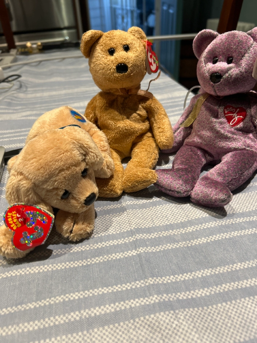 Selling a lot of three adorable Beanie Babies! You'll get a cute tan bear, a sweet purple bear with a heart, and a cuddly tan dog. All are in good condition and ready for a new home