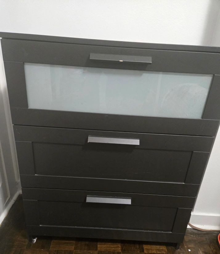 Selling a gently used IKEA Brimnes 3-drawer chest in black. It's in great shape and perfect for adding storage to any room. The top drawer has a frosted glass look!