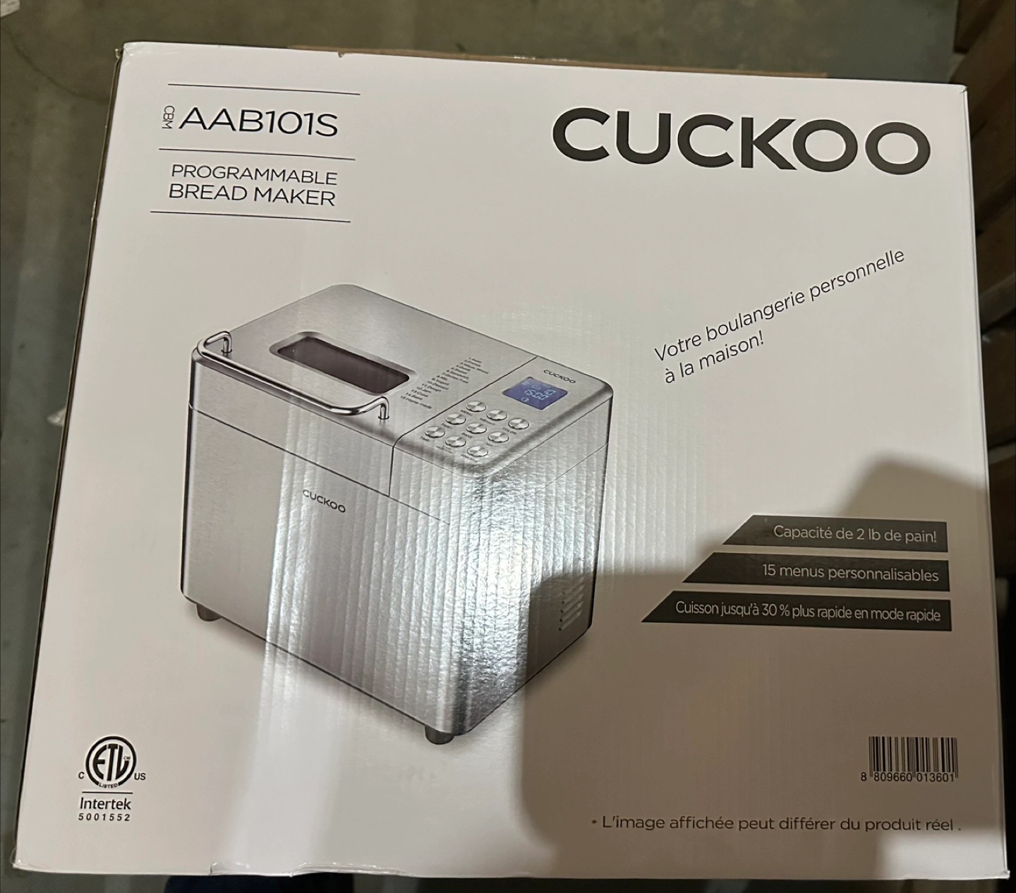 I'm selling a Cuckoo AAB101S programmable bread maker! It can make up to 2 lb of bread and has 15 customizable menu options. The box is included!