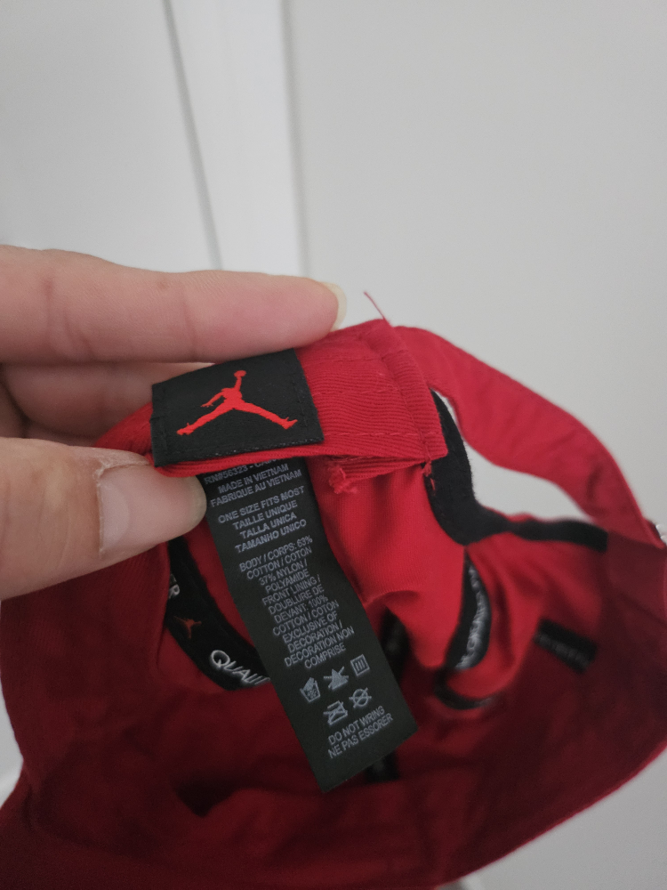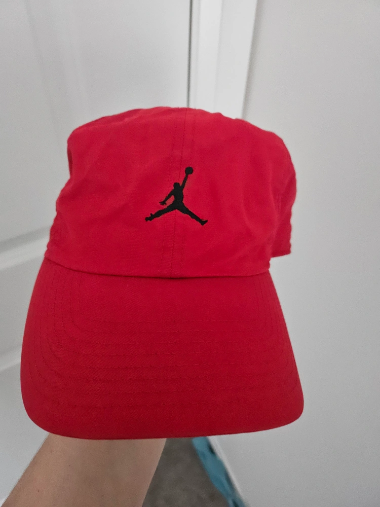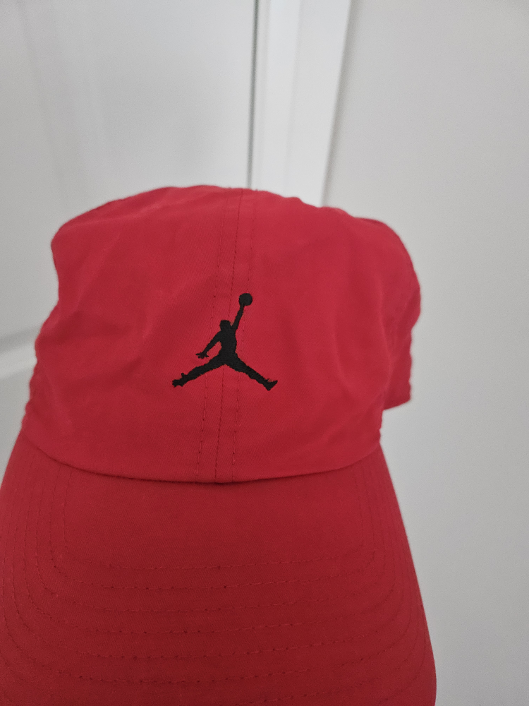 Selling a red Jordan cap in great condition! It features the iconic Jumpman logo. The size is adjustable, so it should fit most people. The material is a comfortable blend of cotton and nylon.