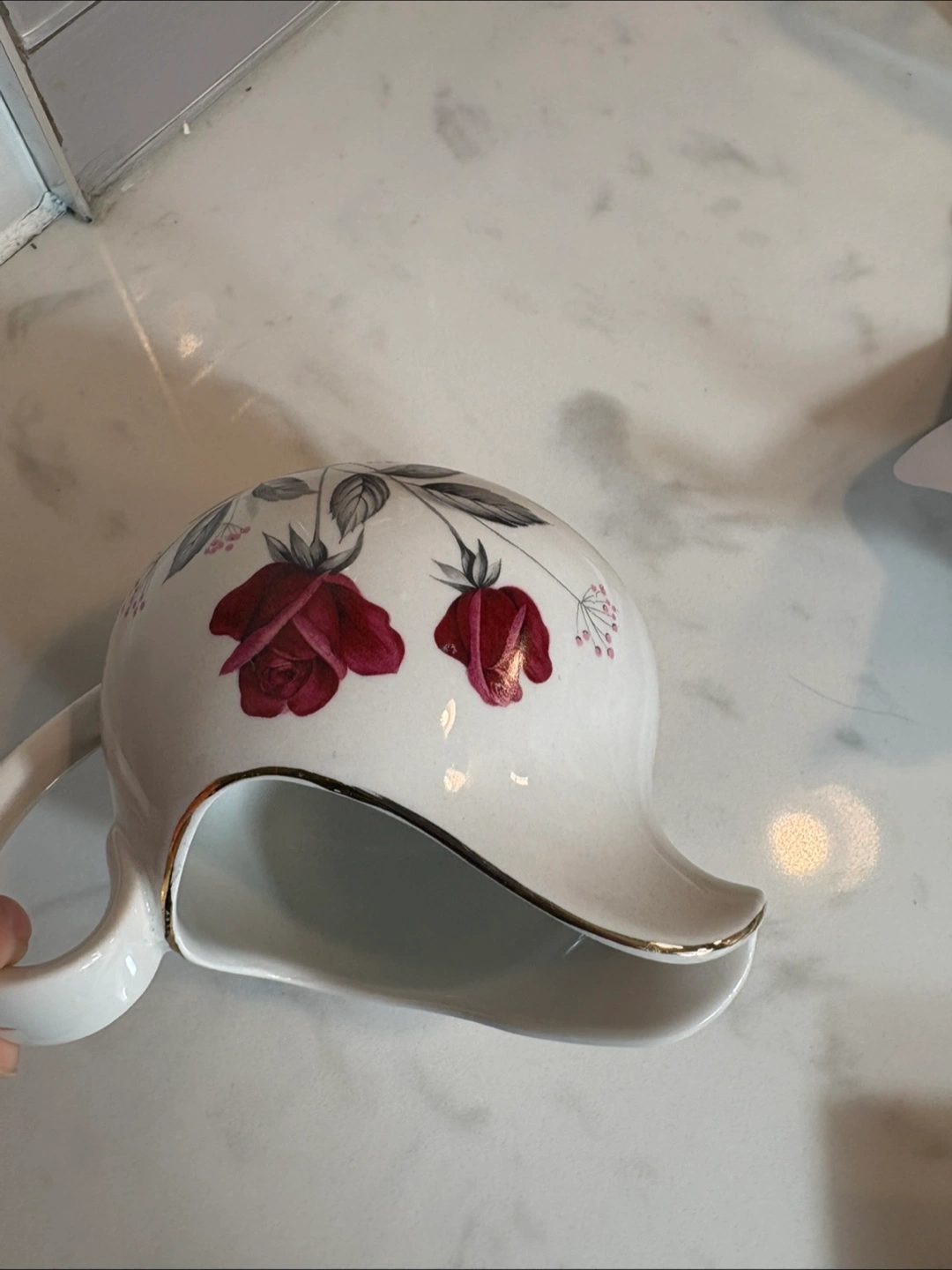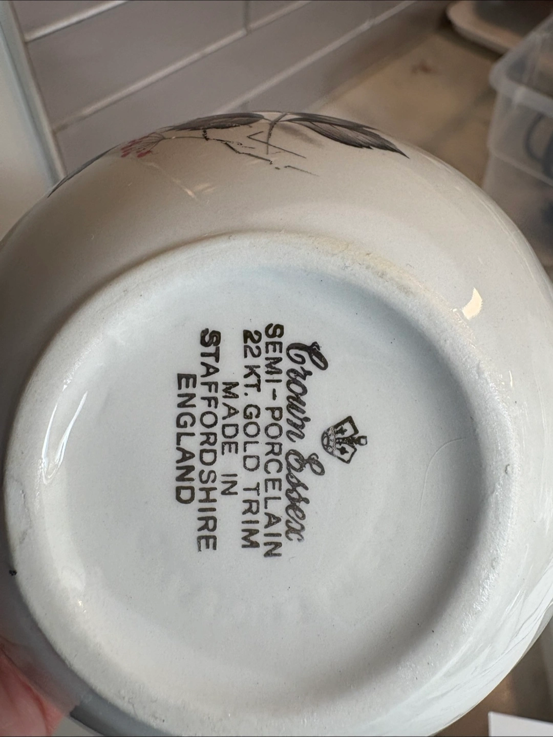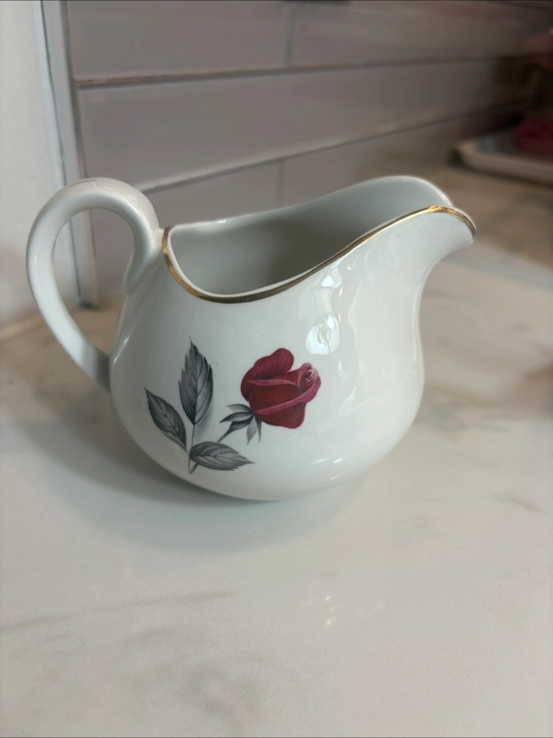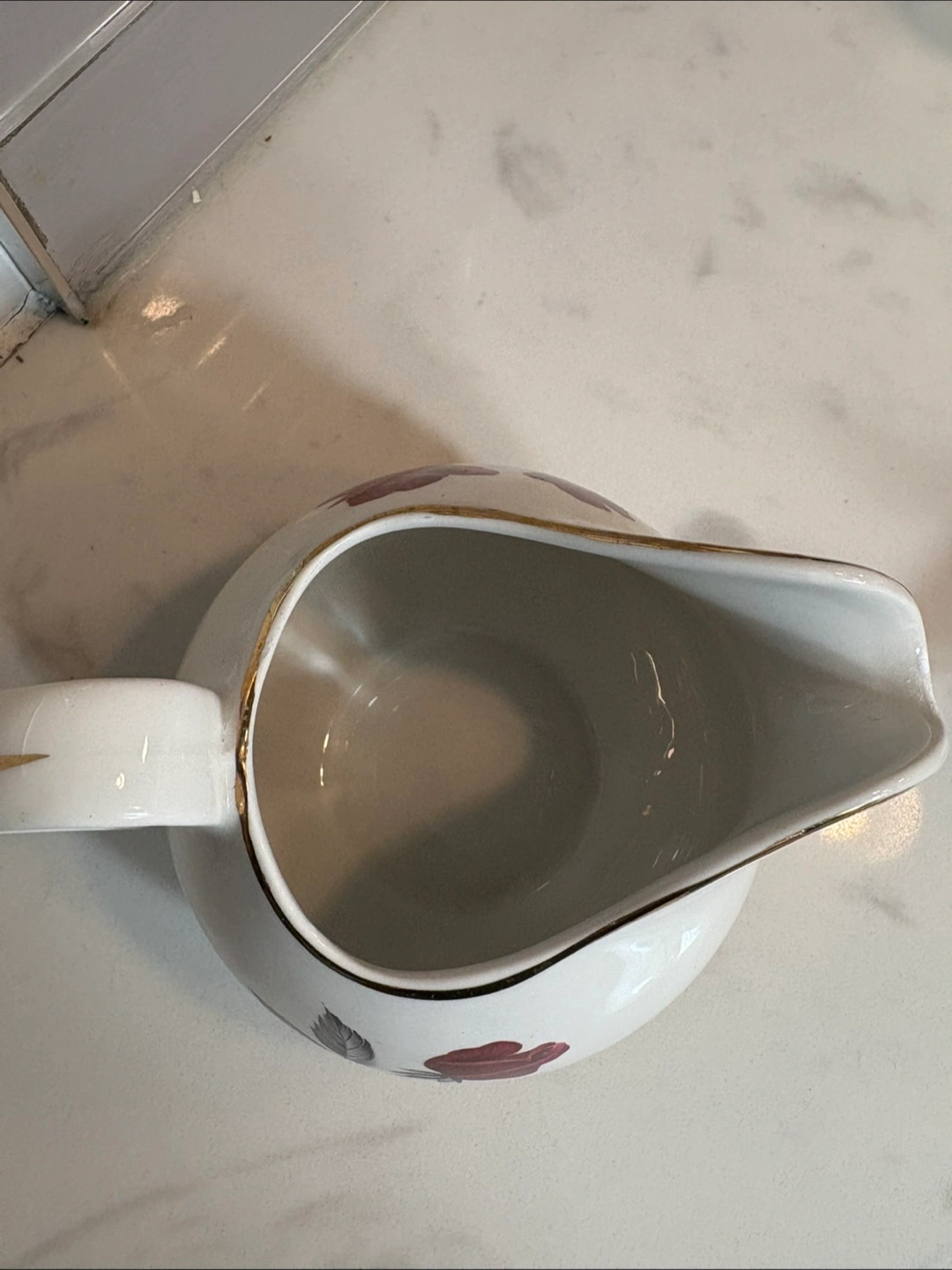 525Selling a Crown Essex Semi-Porcelain creamer with 22kt gold trim. It's made in Staffordshire, England and features a lovely rose design