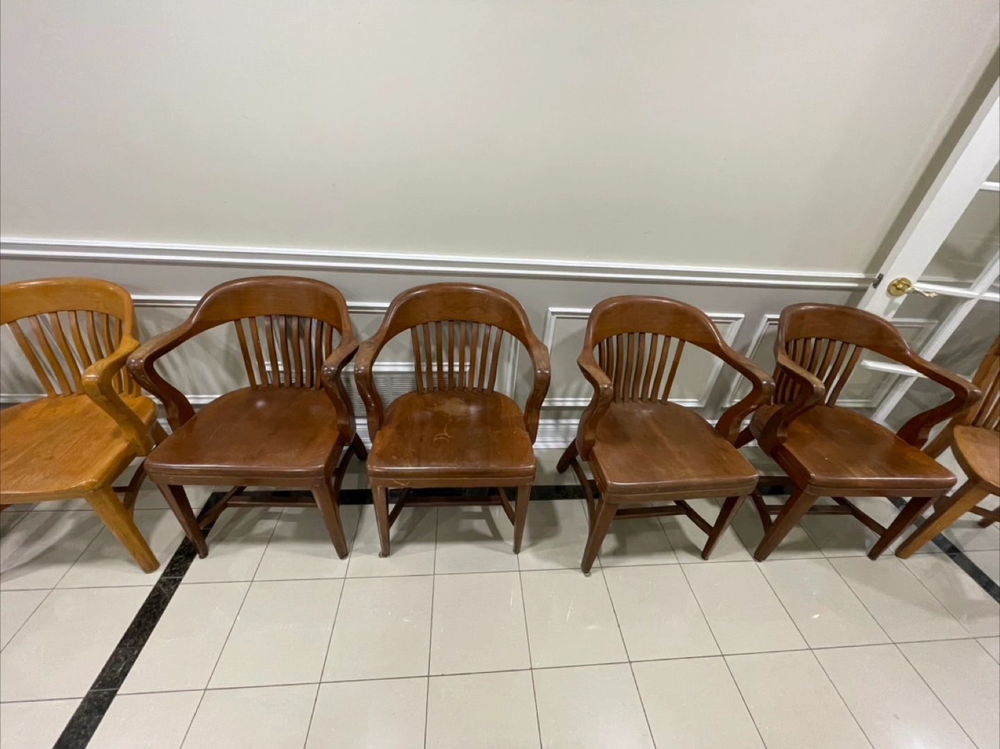 Selling a set of wooden chairs. They would be perfect for an office or dining room. There are varying shades of brown and some have wheels!