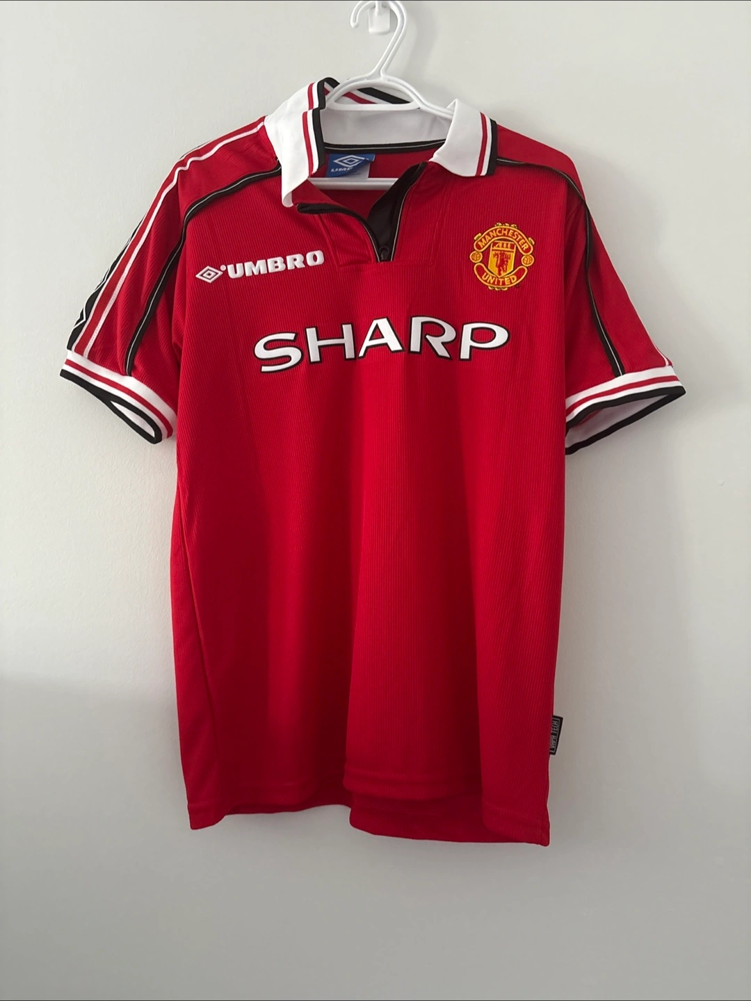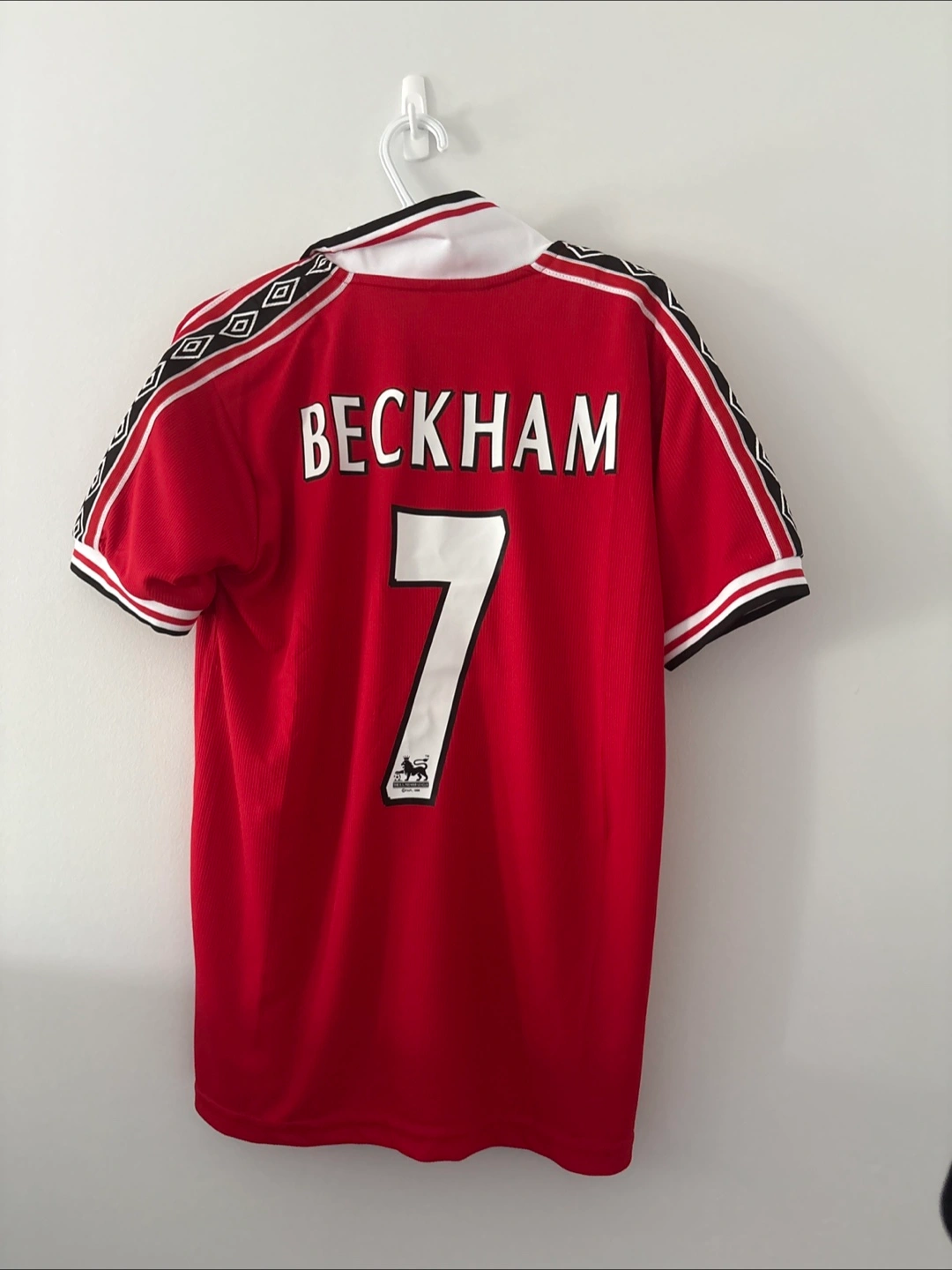Selling a vintage Manchester United jersey with Beckham's name and number 7 on the back! The jersey is red with white and black trim, and features the Umbro logo and the Manchester United crest.