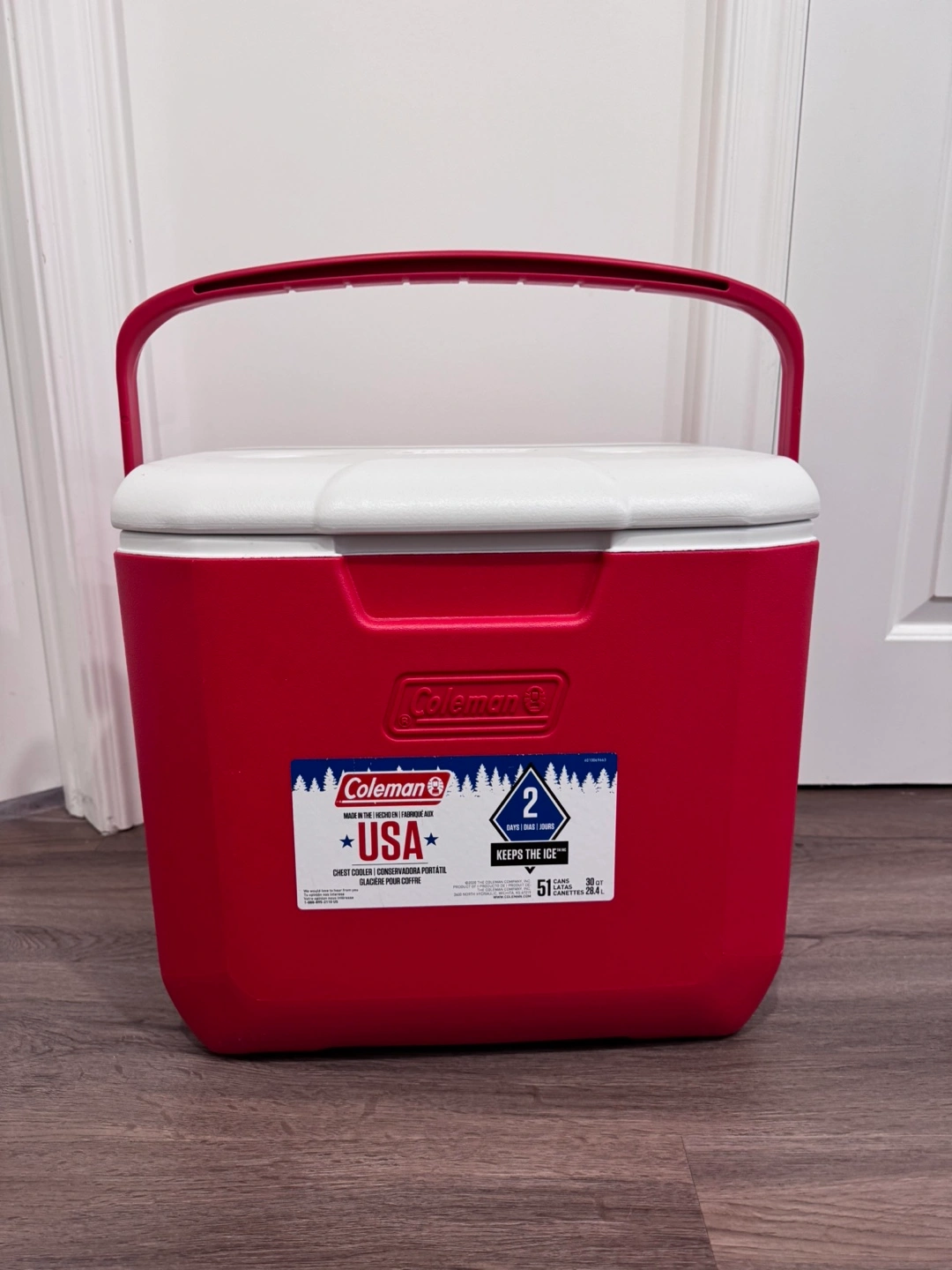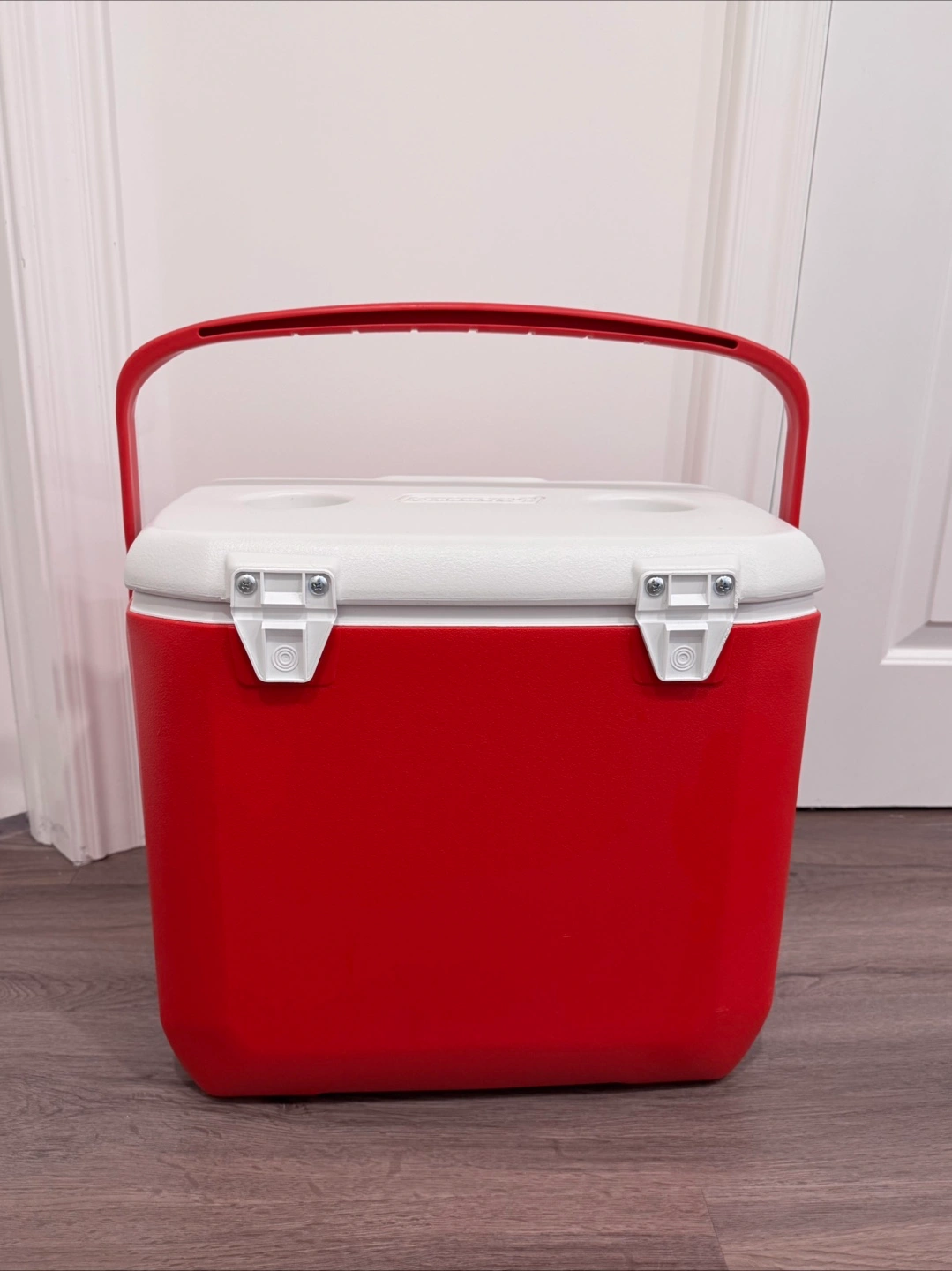 Selling a Coleman cooler in great shape! It's red and white, and has a capacity of 51 cans. Perfect for keeping your drinks and snacks cold on picnics or camping trips!
