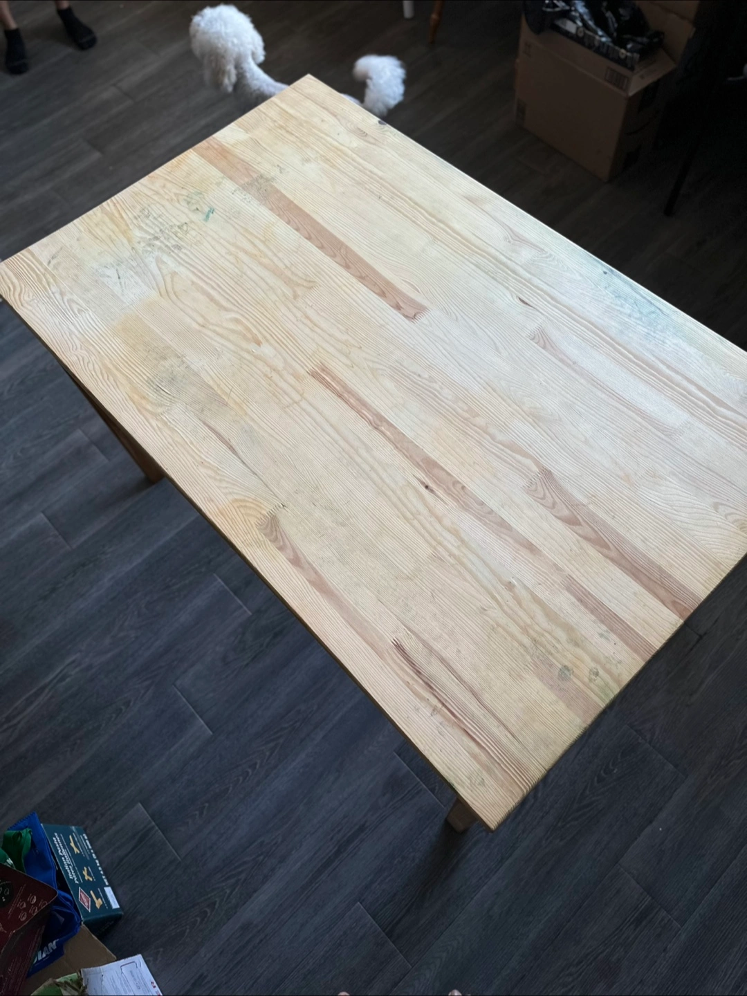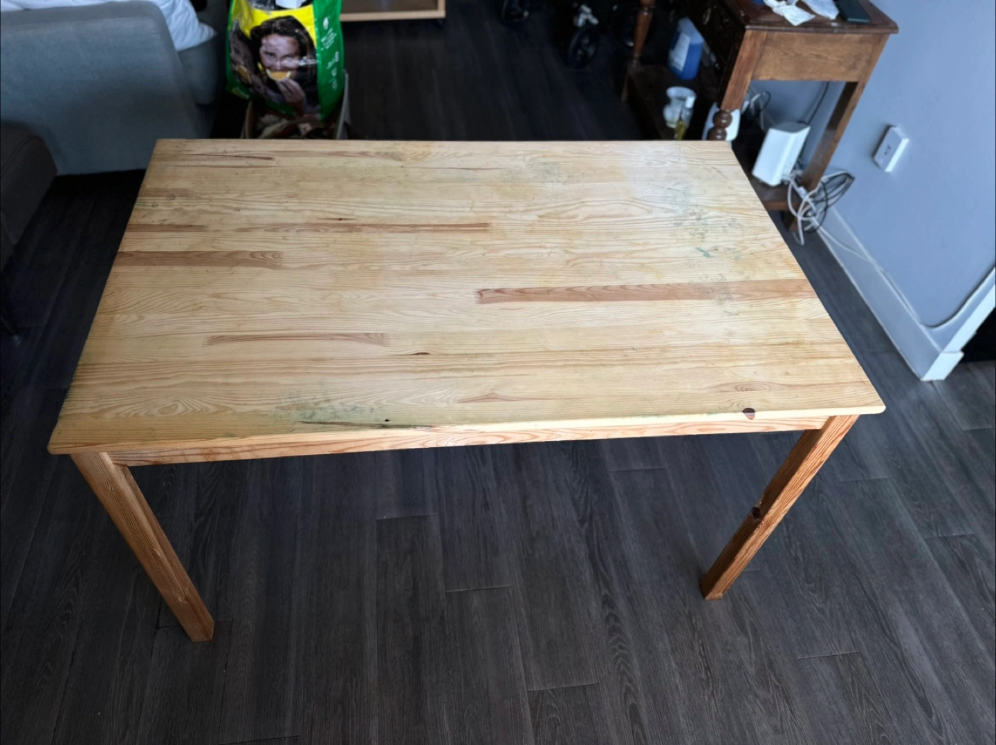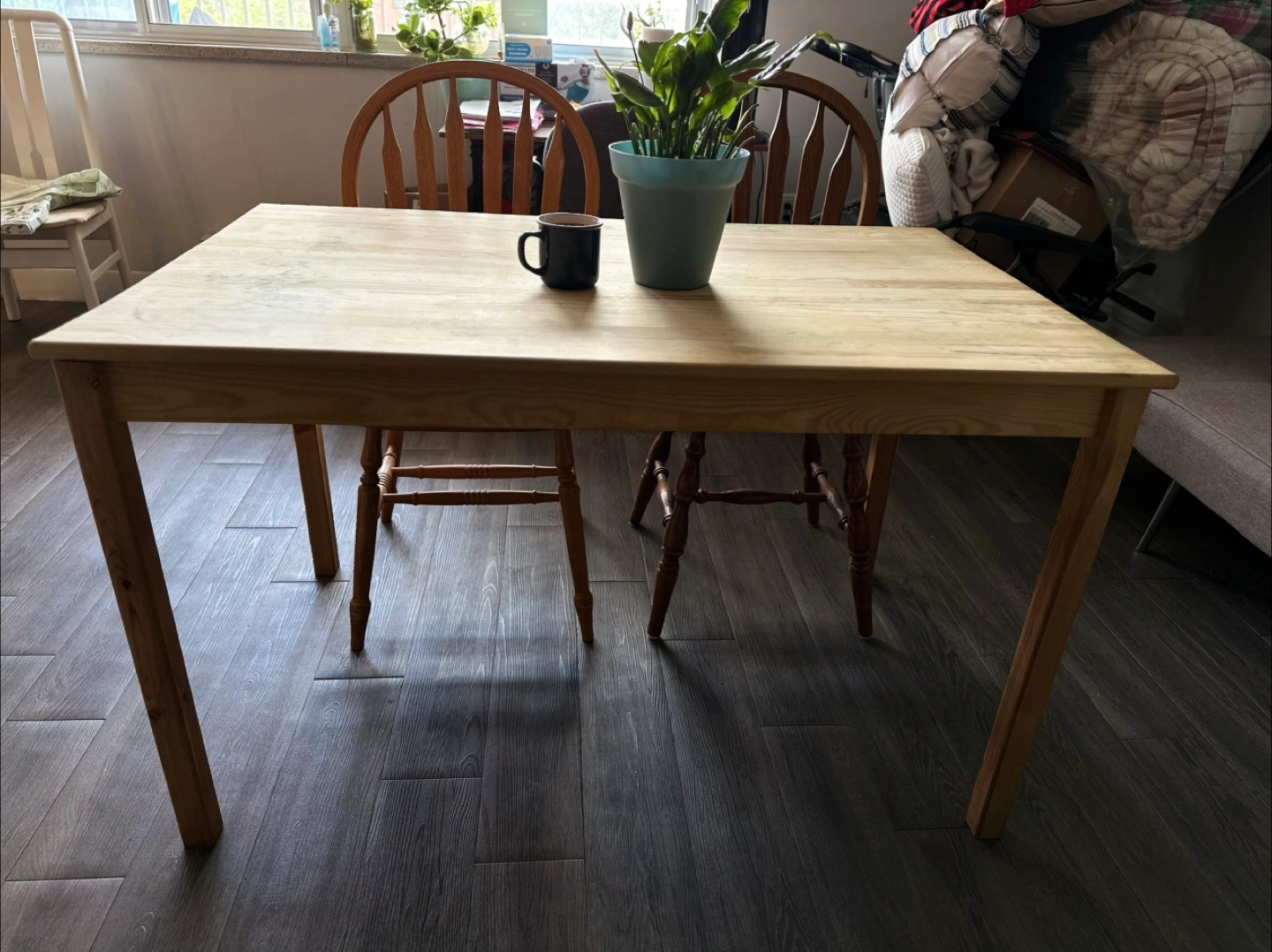 IKEA Ingo wooden dining table, seats 6, or 4 comfortably. Sturdy and classic. Some stains from a cheap tablecloth that had leaked through. Should be easily removed with some light sanding, or dress it up with your own favourite tablecloth! This table has plenty of good life left. Selling as we’re moving.