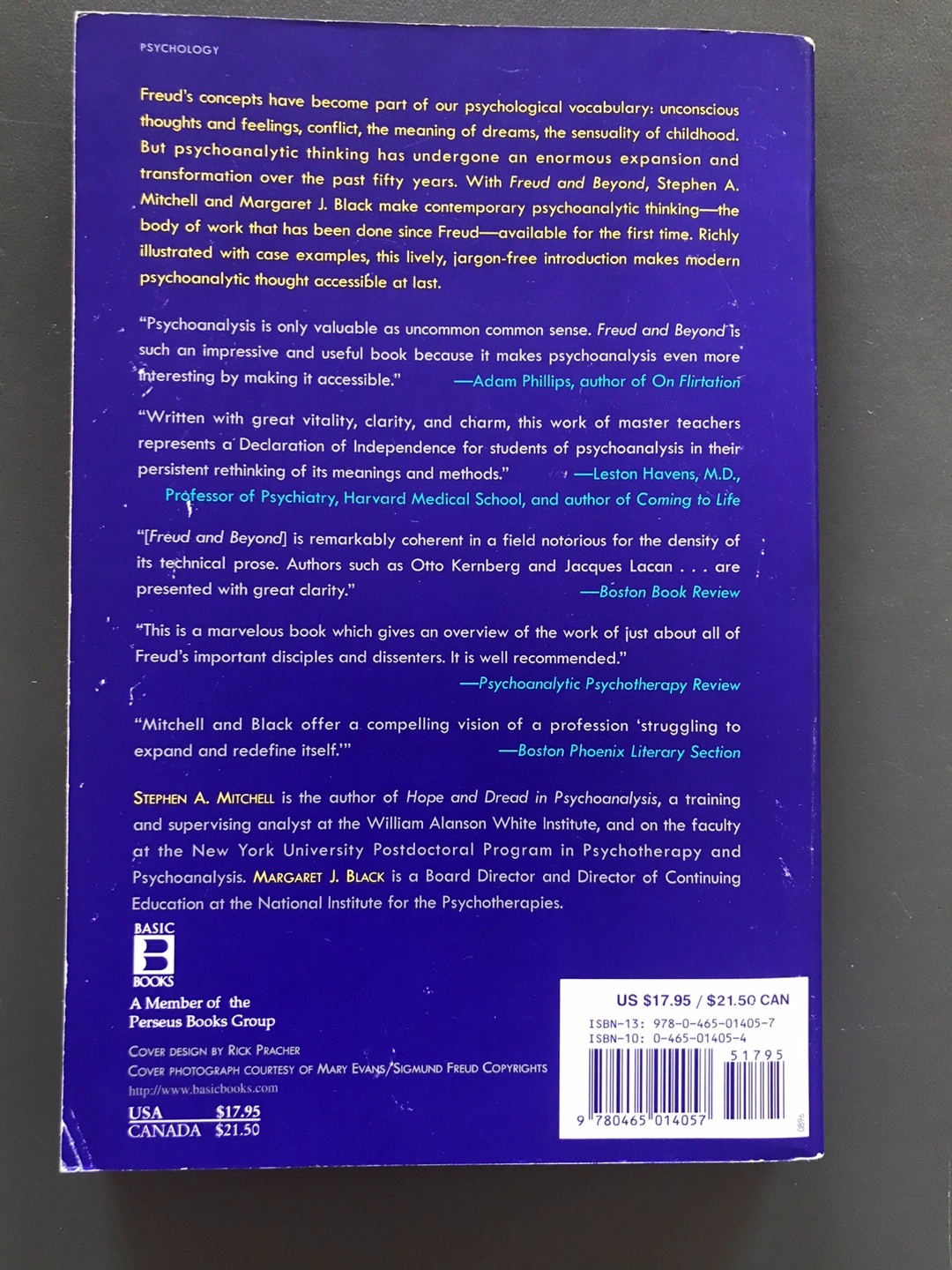 Selling the book Freud and Beyond by Stephen A. Mitchell and Margaret J. Black. It offers a history of modern psychoanalytic thought. This book is an introduction to psychoanalytic thought accessible at last. Originally, this book was sold for $17.95.